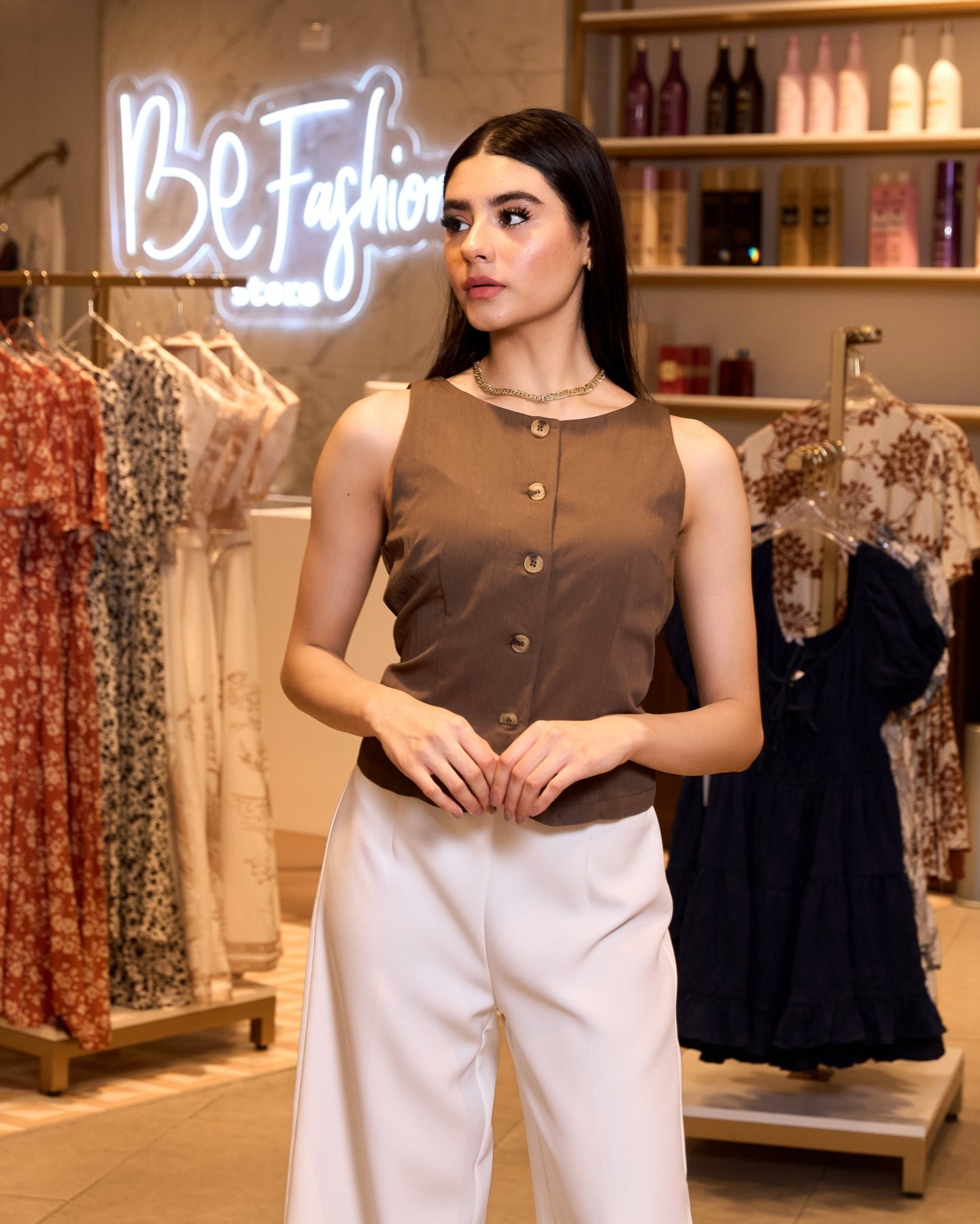 Un básico versátil que aporta un toque elegante y moderno a cualquier look. Este chaleco cuenta con botones frontales y ajuste en la espalda con moño, lo que permite entallar la silueta de forma favorecedora. Perfecto para combinar con camisas, blusas o incluso usarlo solo como pieza principal en un outfit trendy.