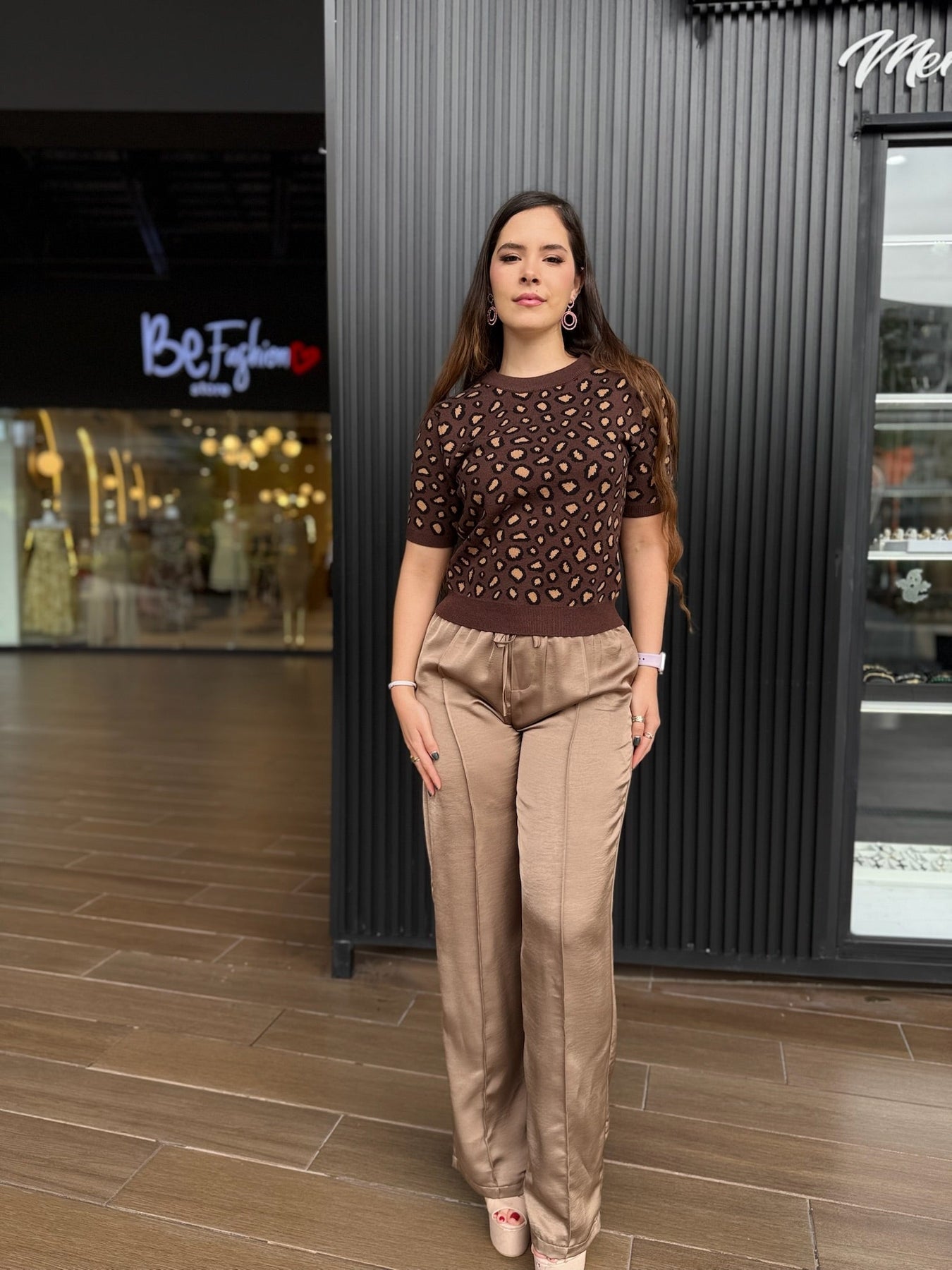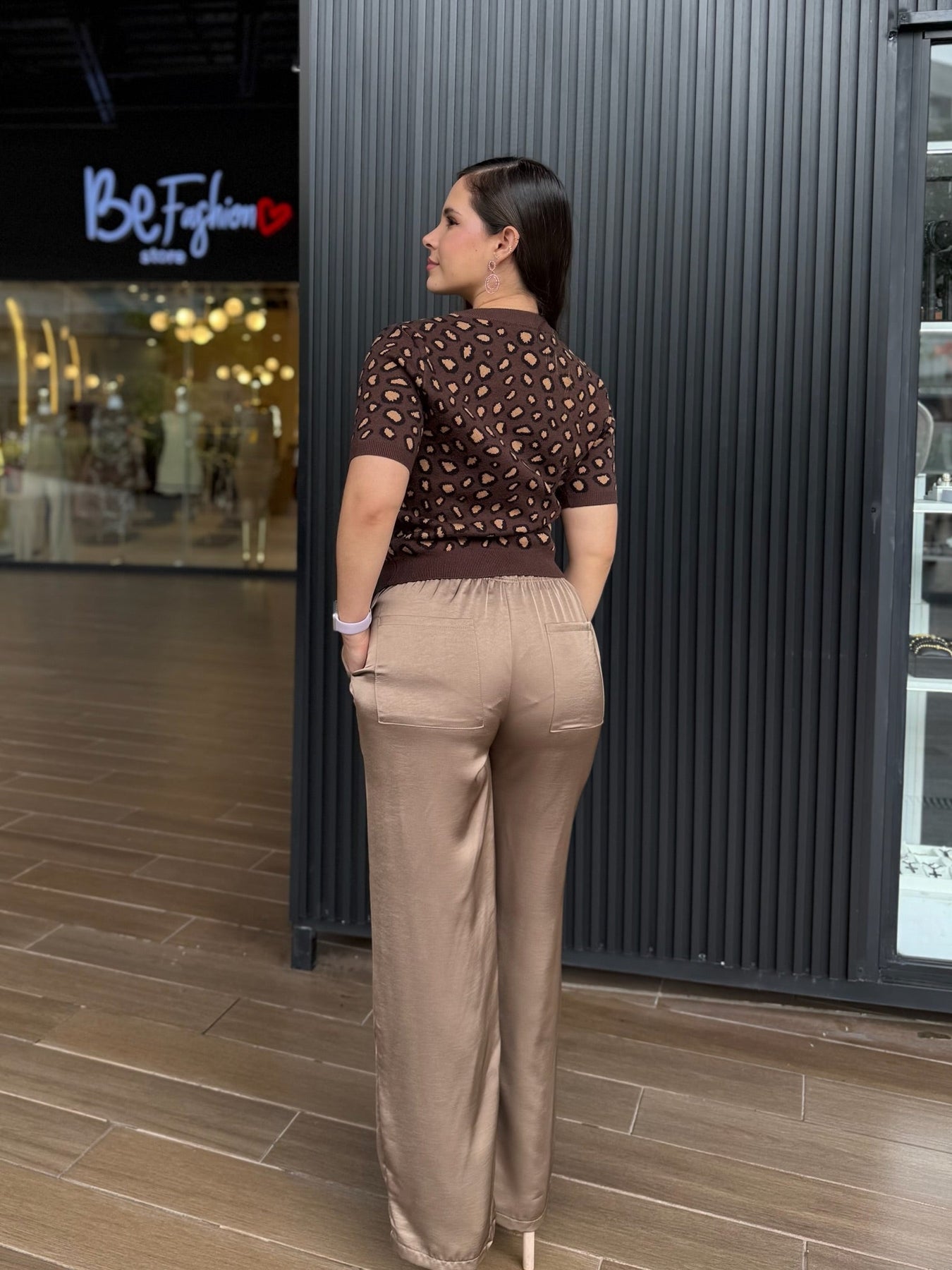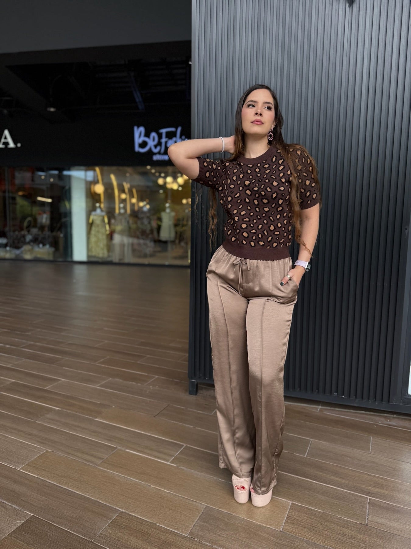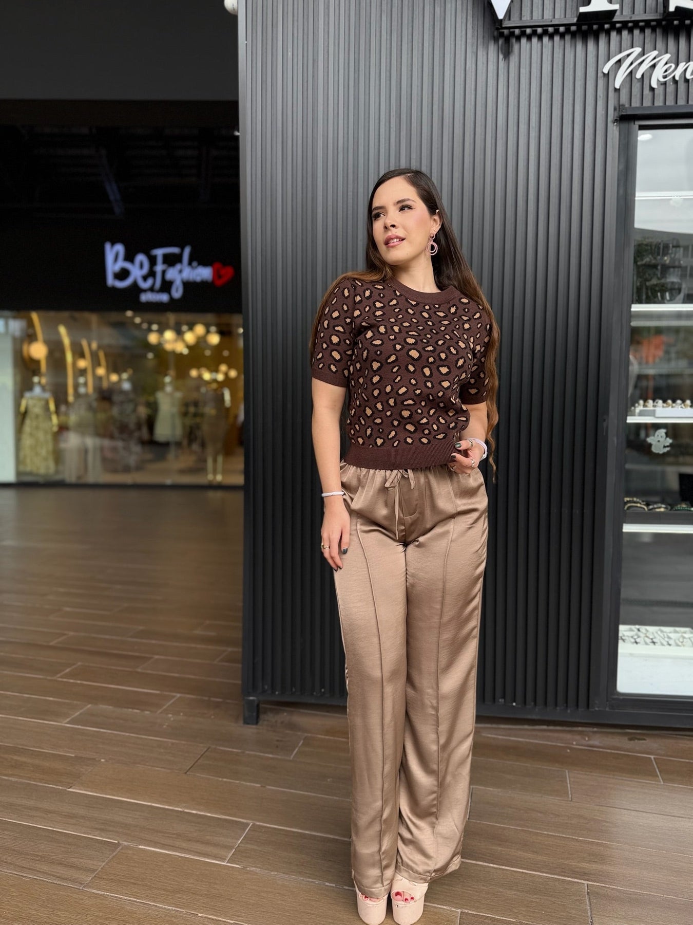 Suéter tejido con estampado leopard print en tonos café y beige, un clásico que nunca pasa de moda. Su textura suave y manga corta lo hacen perfecto para entretiempo.