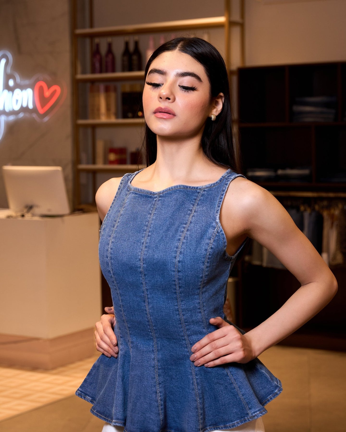 Una prenda moderna y estructurada que realza tu silueta con estilo. Esta blusa tipo corset de mezclilla cuenta con costuras visibles que estilizan la figura y un corte peplum que aporta movimiento. Su diseño sin mangas la hace perfecta para looks casuales chic, combinando con pantalones blancos, faldas o shorts para un outfit versátil y en tendencia.