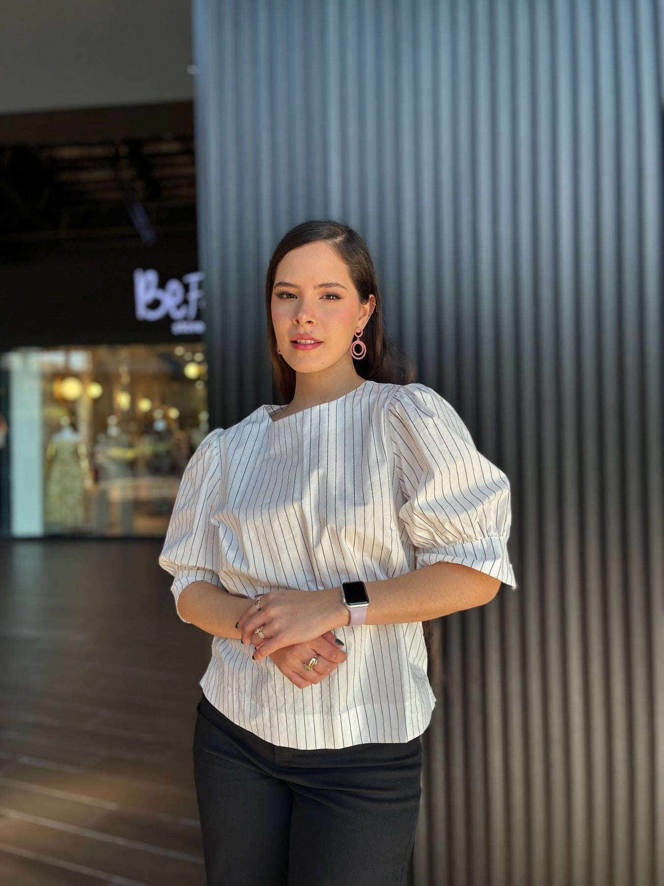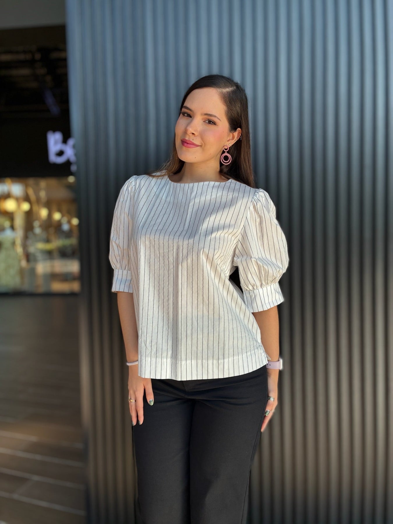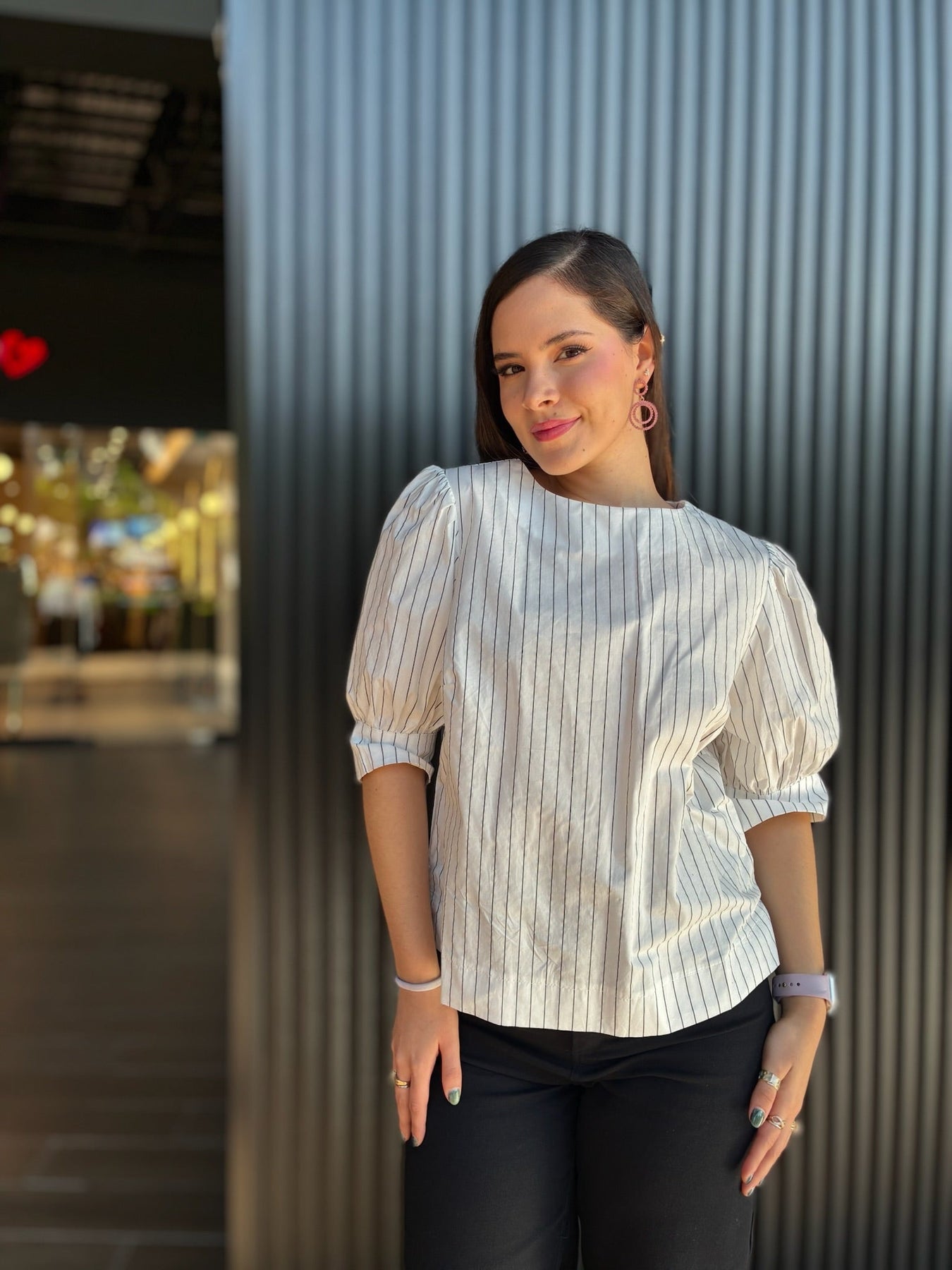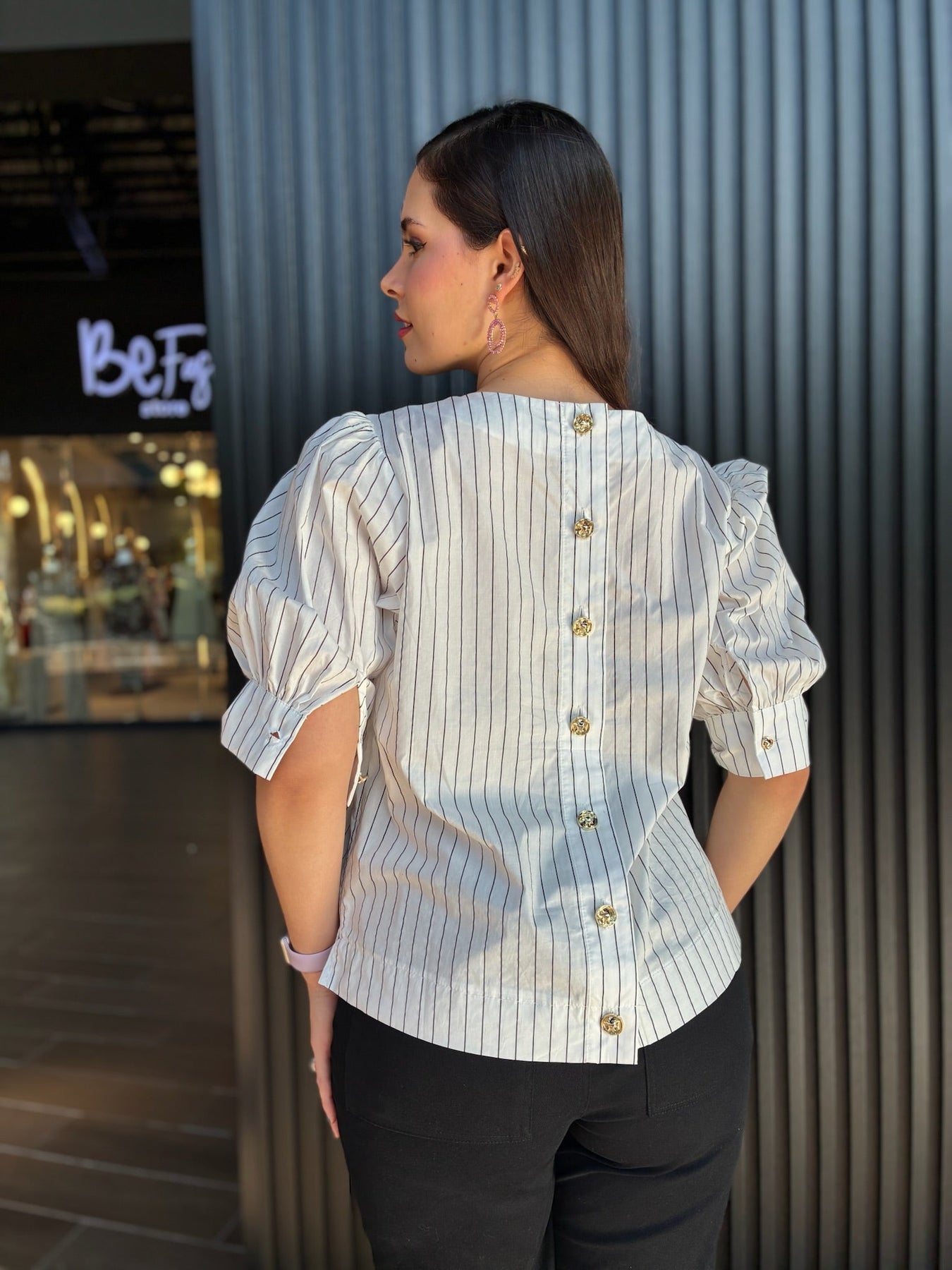 Blusa estructurada con mangas abullonadas tres cuartos y botones decorativos dorados en la parte trasera, que le dan un toque vintage chic. El estampado de rayas verticales estiliza y aporta elegancia atemporal.