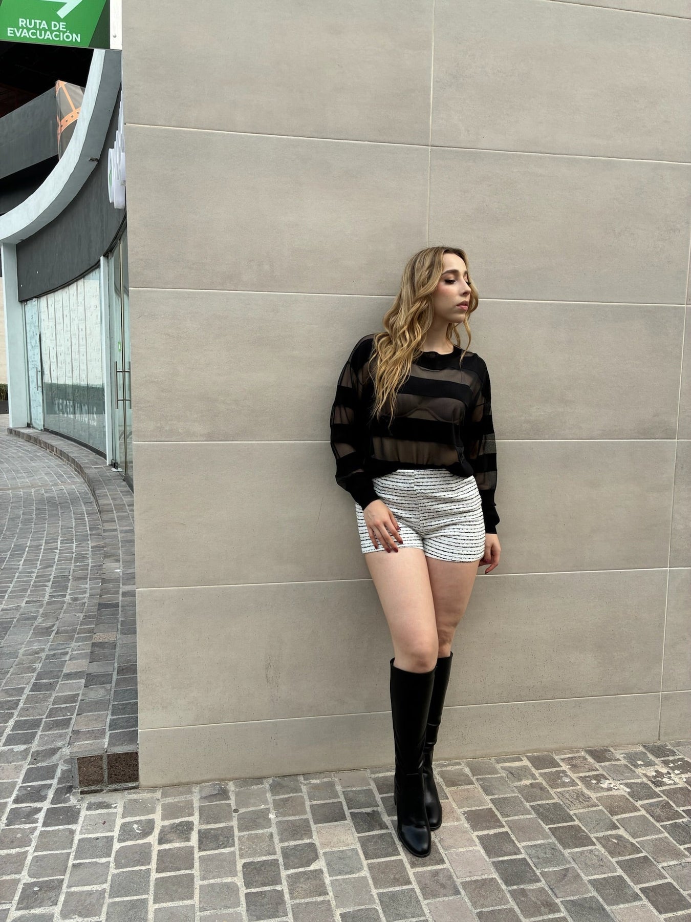 Con un diseño de rayas horizontales que alternan entre tejido opaco y secciones sheer, creando un efecto visual dinámico y muy sexy. Es una prenda de manga larga, cuello redondo y corte oversize o relajado que contrasta con la naturaleza atrevida del tejido.