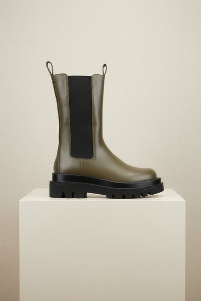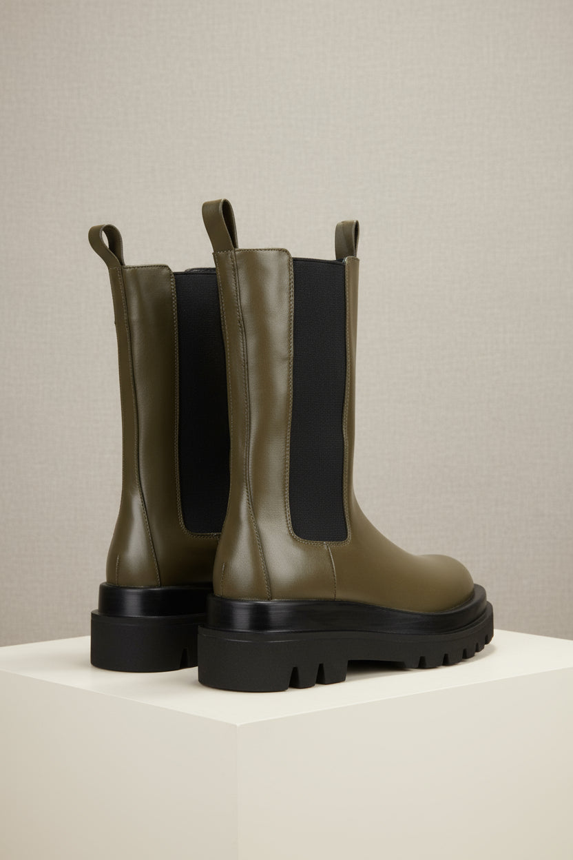 Bota Color Olive. Suela Ancha Track. Acabado En Punta Redonda
