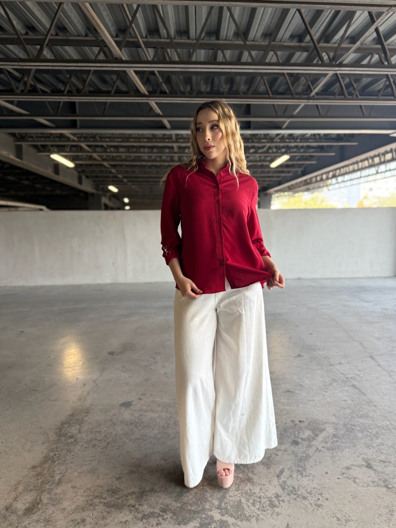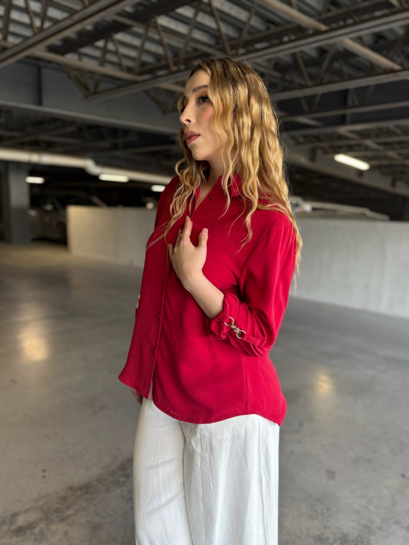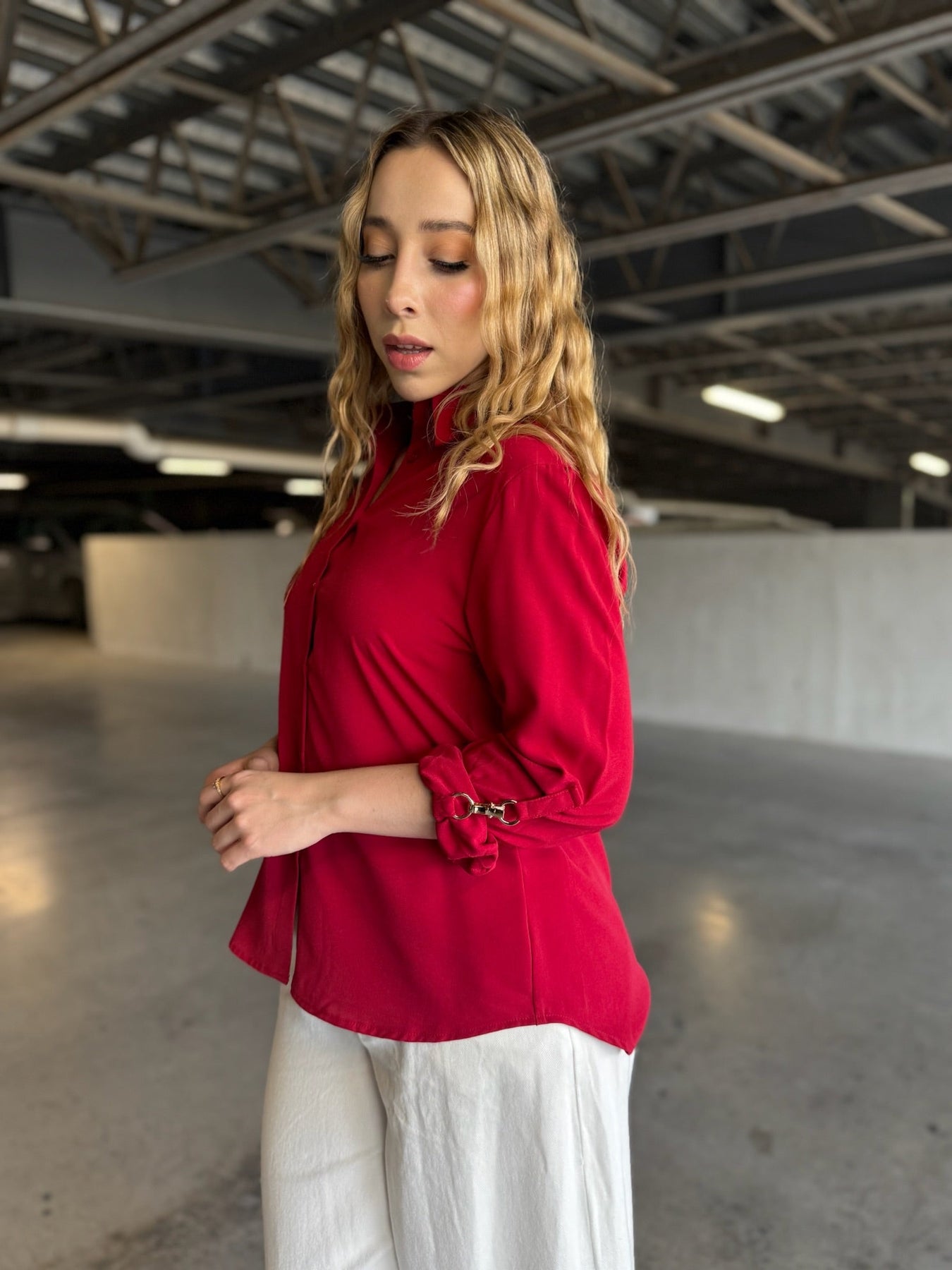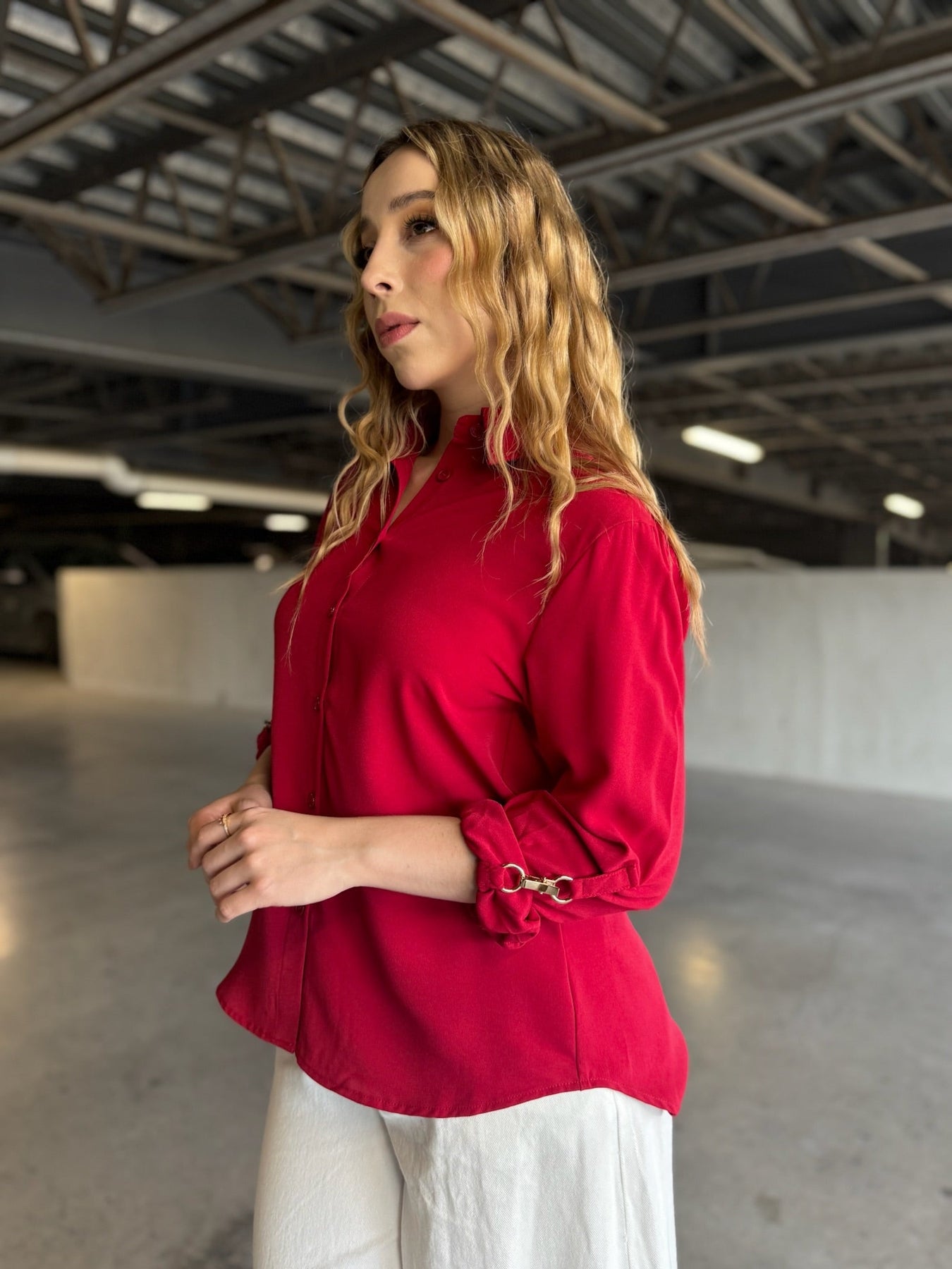 Rojo cereza intenso en crepe premium, corte recto ligeramente oversized, botones ocultos y detalle de herraje dorado en mangas que la hace única.