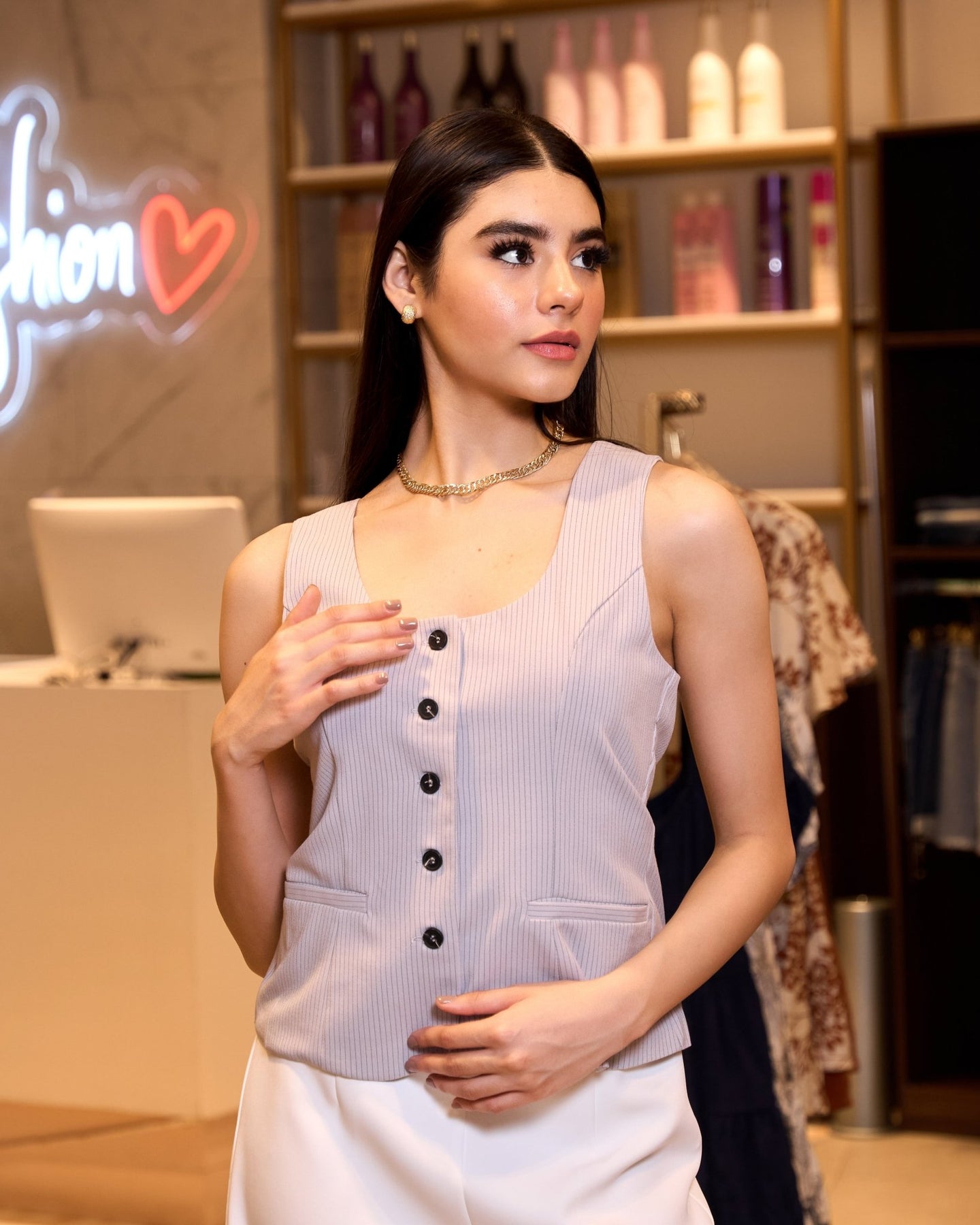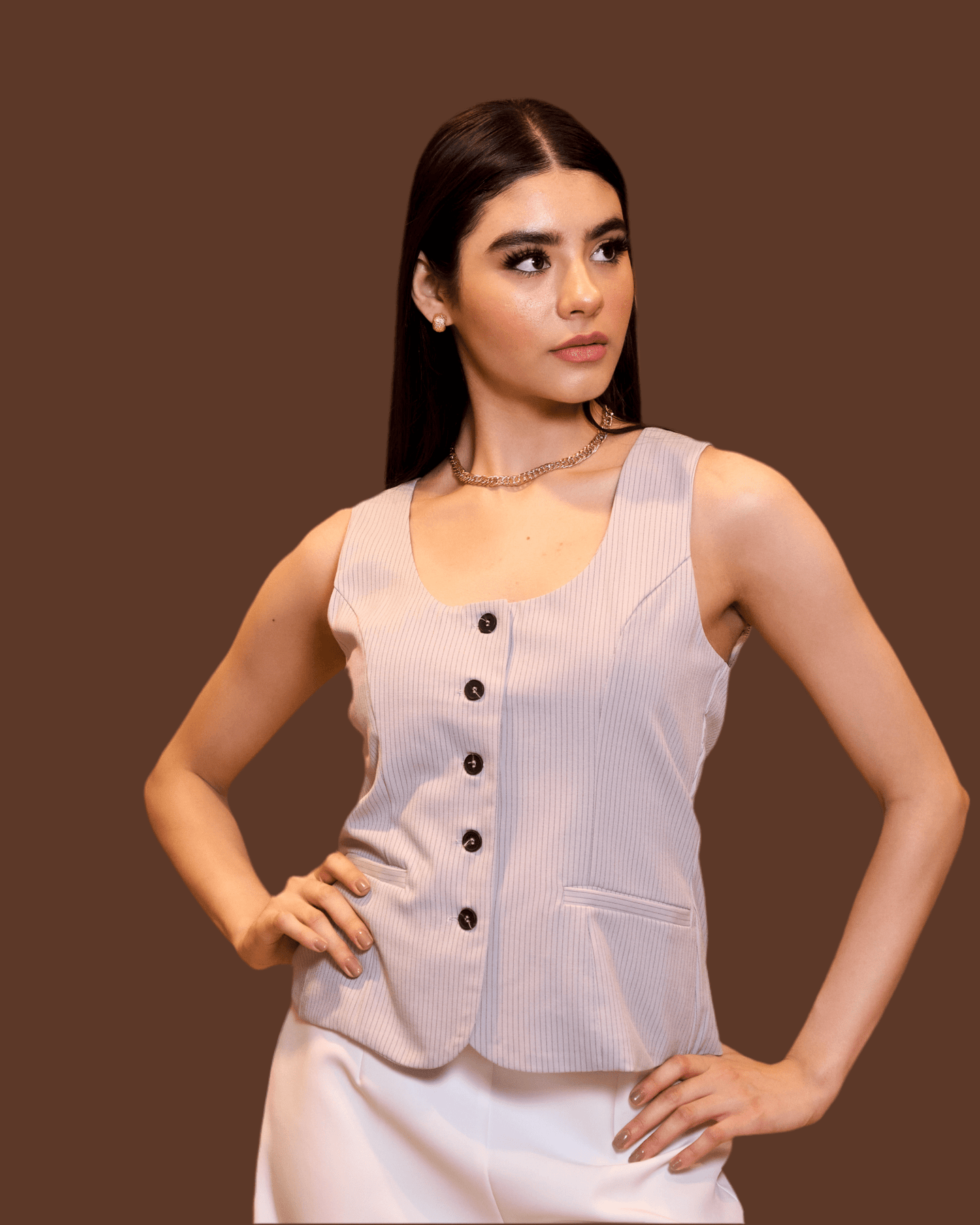 Un básico moderno con inspiración sastrería femenina. Este chaleco entallado en color gris claro cuenta con botones frontales negros y un corte favorecedor que realza la silueta. Su diseño minimalista lo convierte en una pieza versátil, perfecta para combinar con pantalones de vestir, faldas o incluso jeans para un look casual chic.