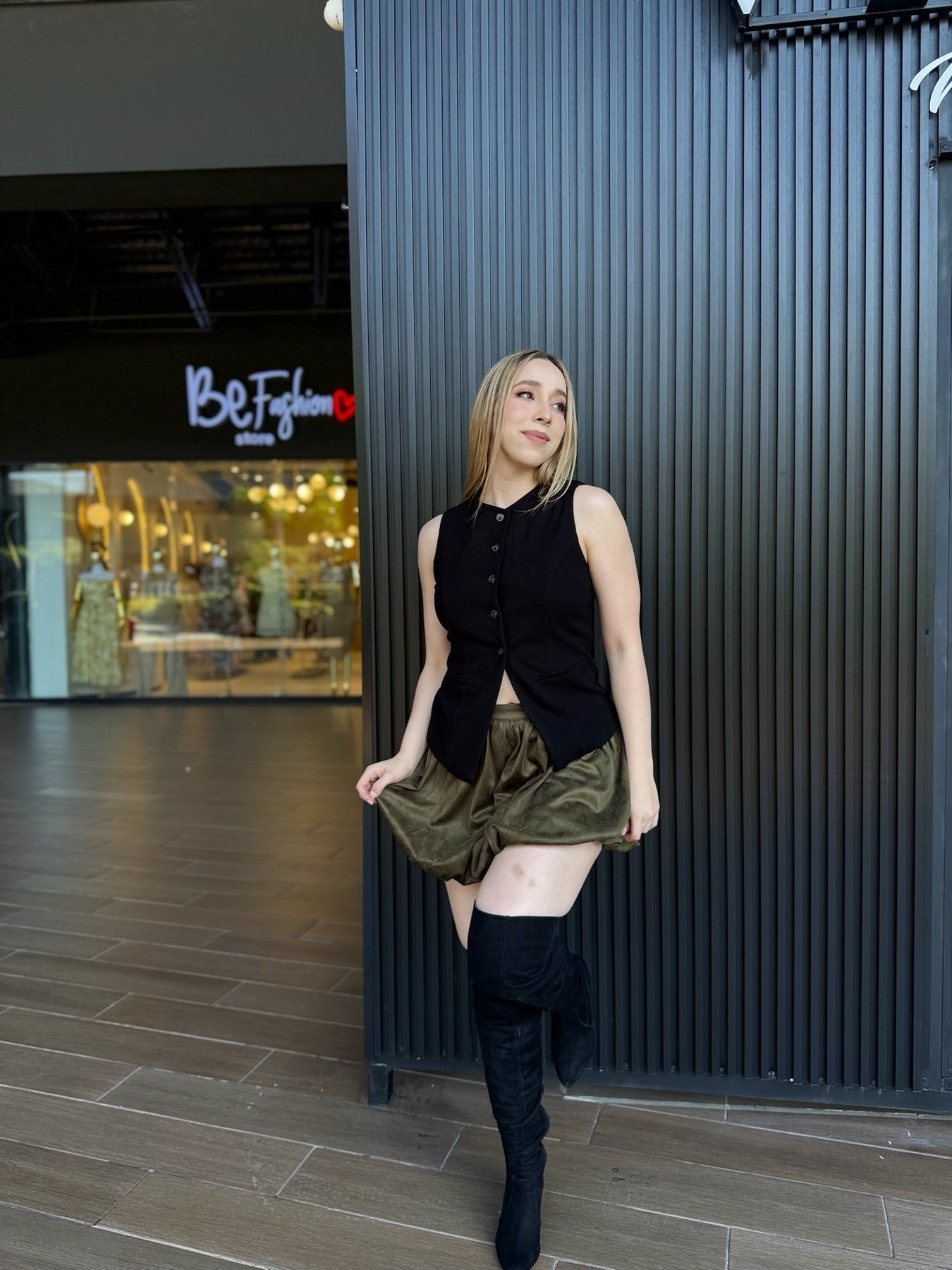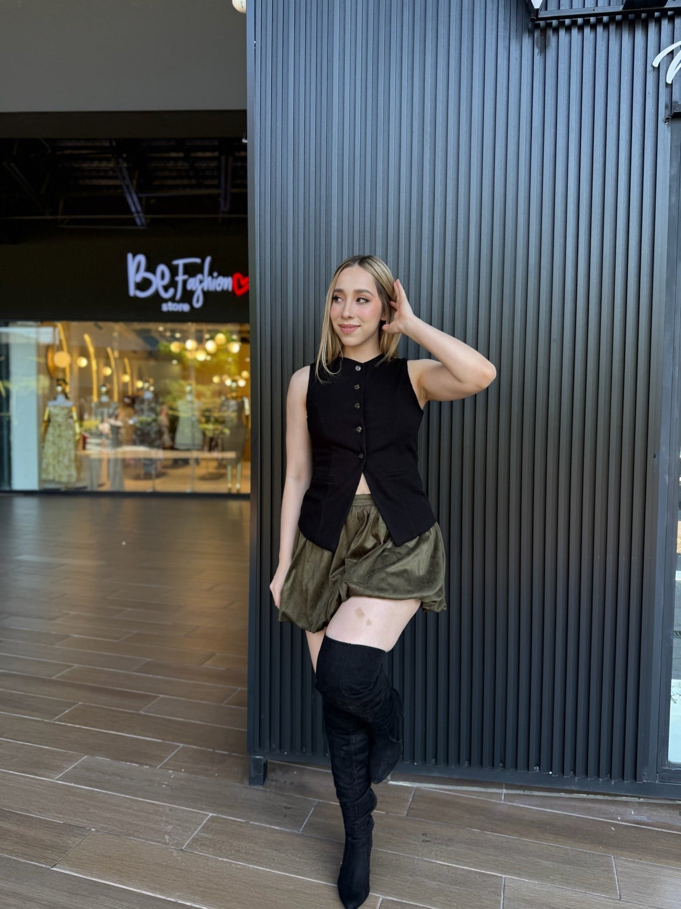 Chaleco de corte estructurado con botones frontales y pinzas que estilizan la figura. Su diseño sastre lo hace ideal para elevar cualquier look.