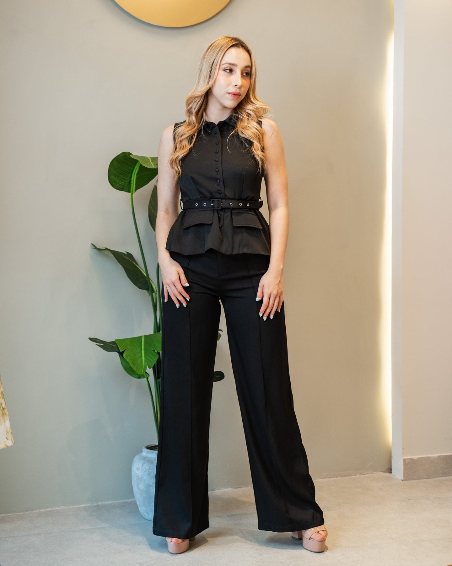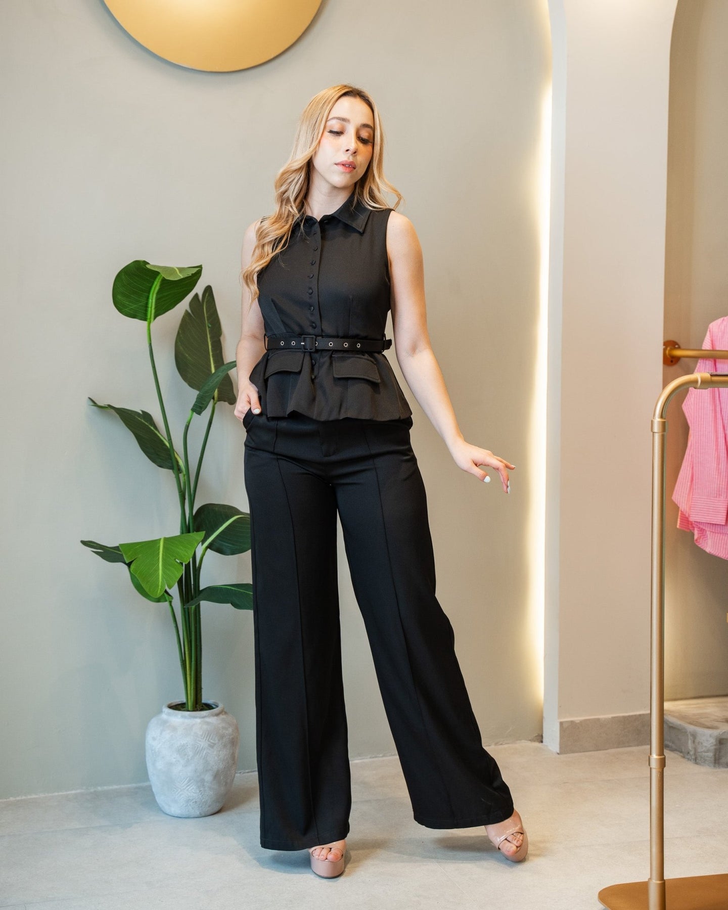 Conjunto de blusa sin mangas con cuello abotonado, pantalones de cintura alta y cinturón.
