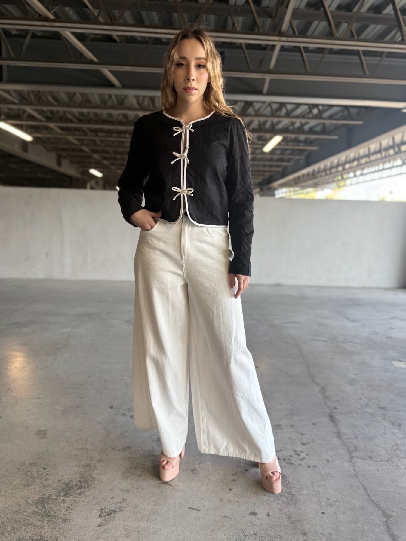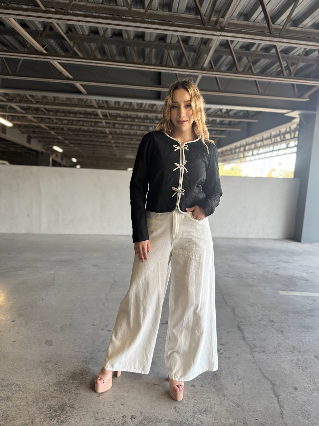 Denim blanco crudo premium, tiro alto, pernera ultra ancha (la más amplia del mercado) y largo tobillero perfecto. Efecto piernas infinitas garantizado. Suavidad brutal y caída impecable.