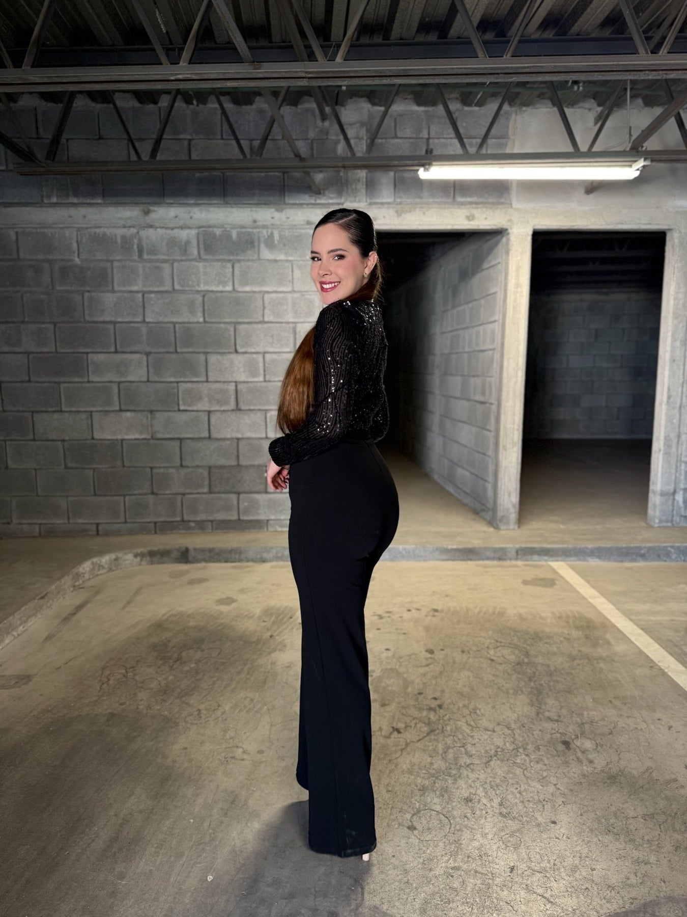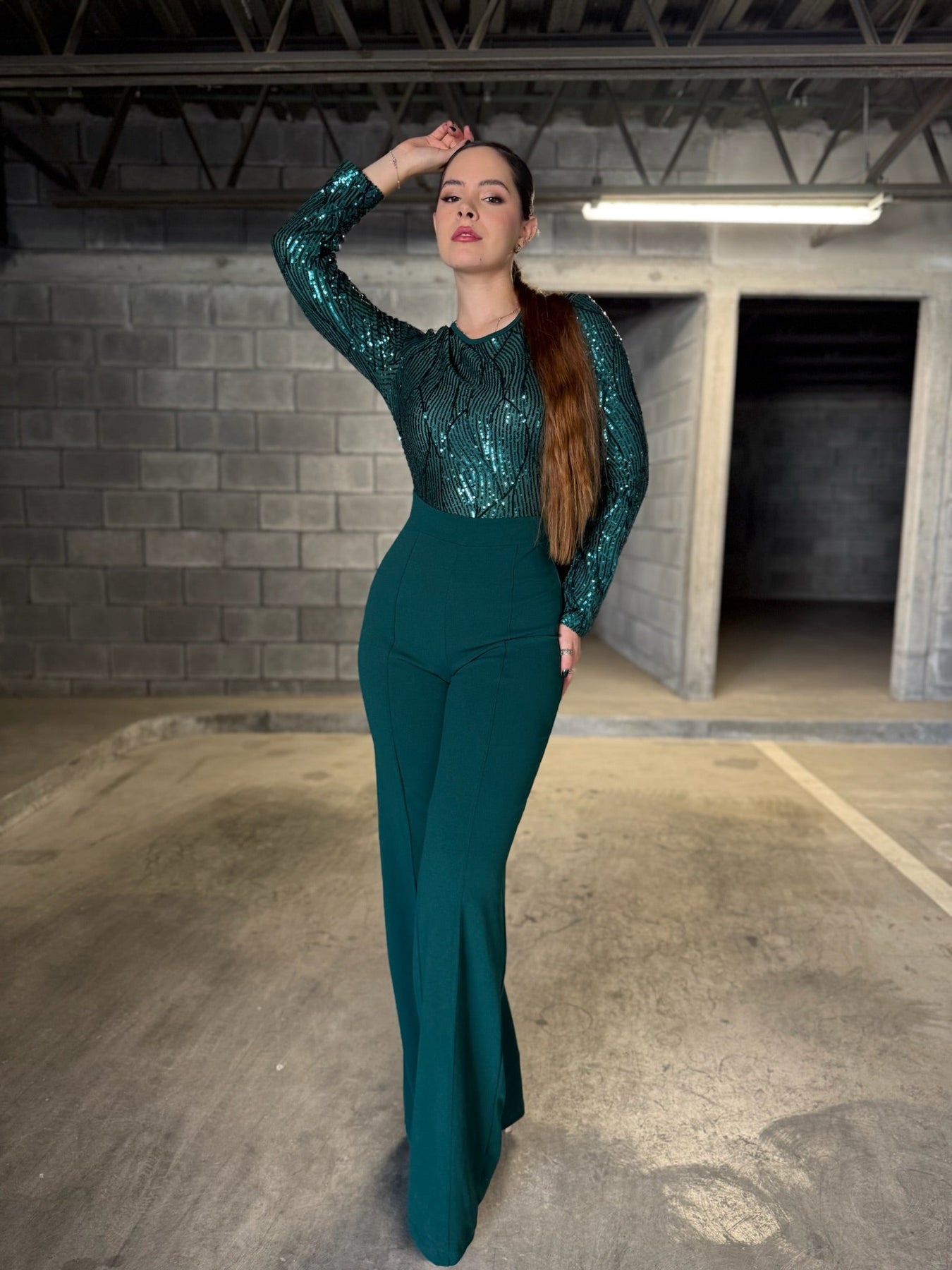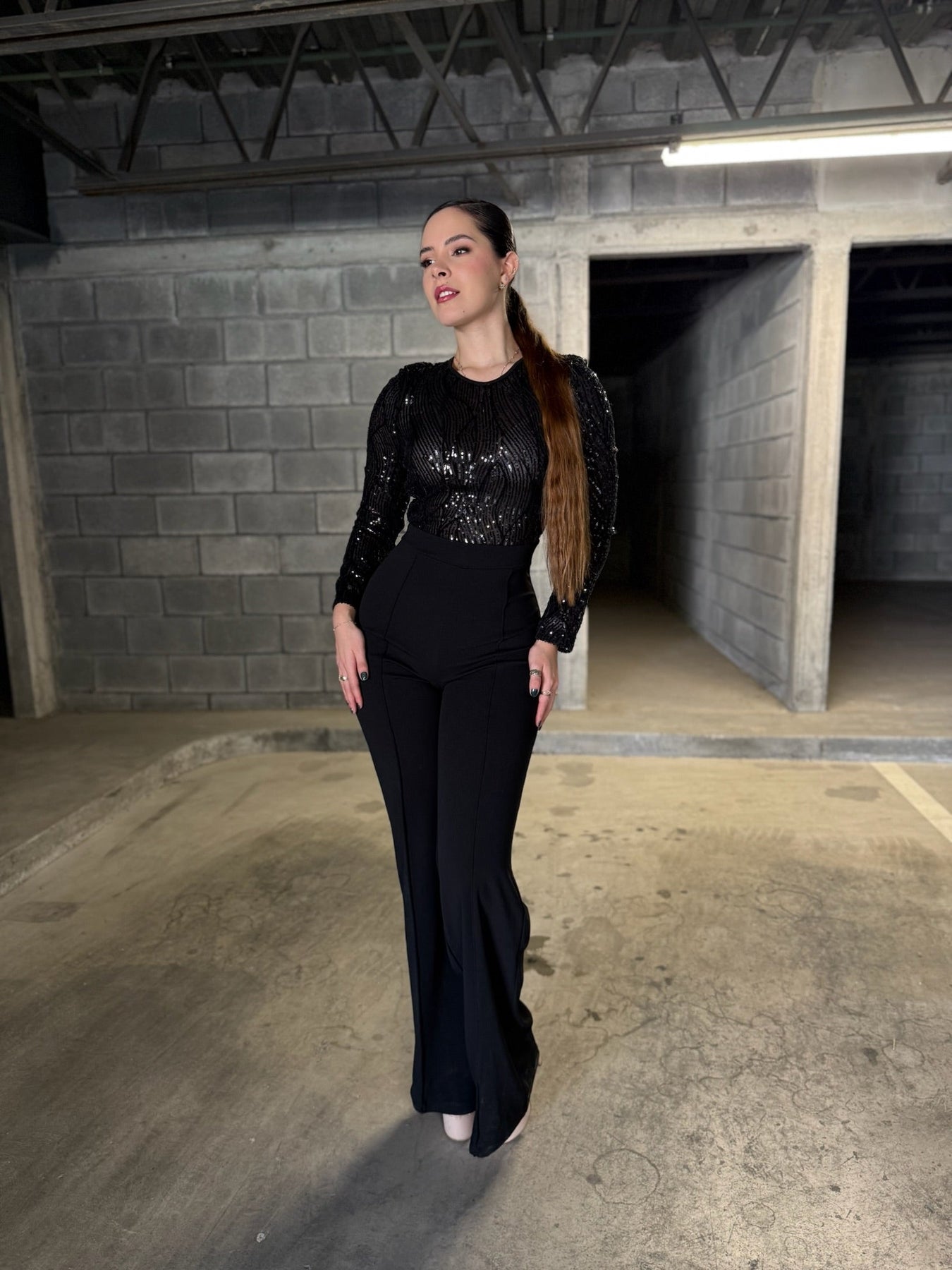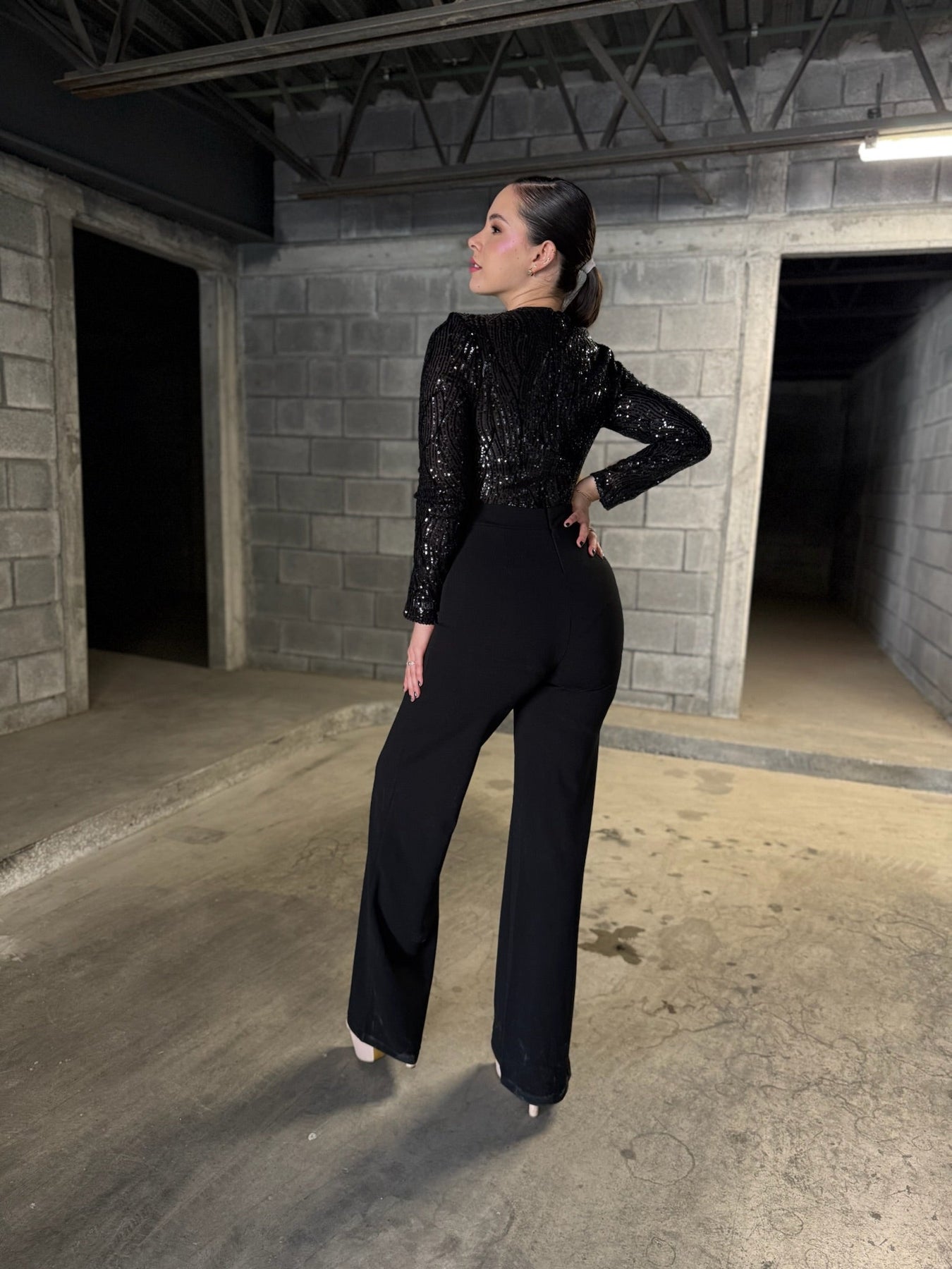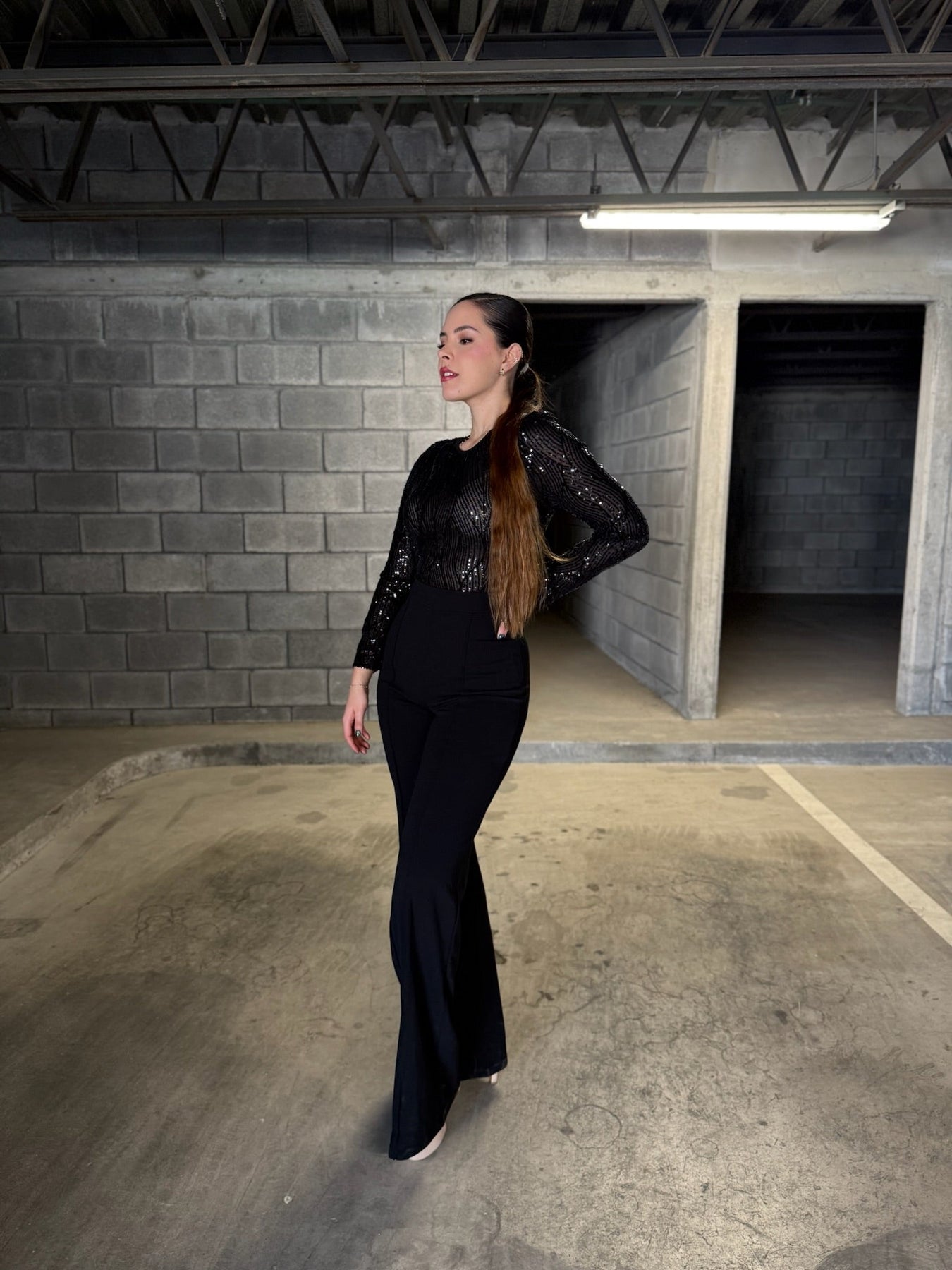 Top de manga larga diseño en lentejuelas + palazzo alta costura. Elegancia y piernas infinitas en un solo clic.