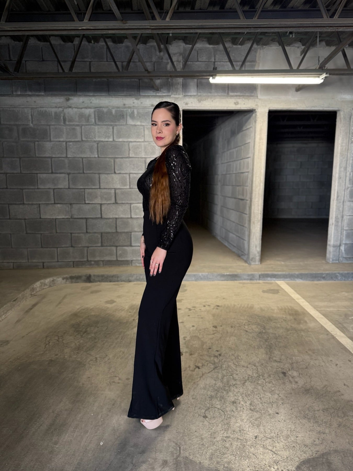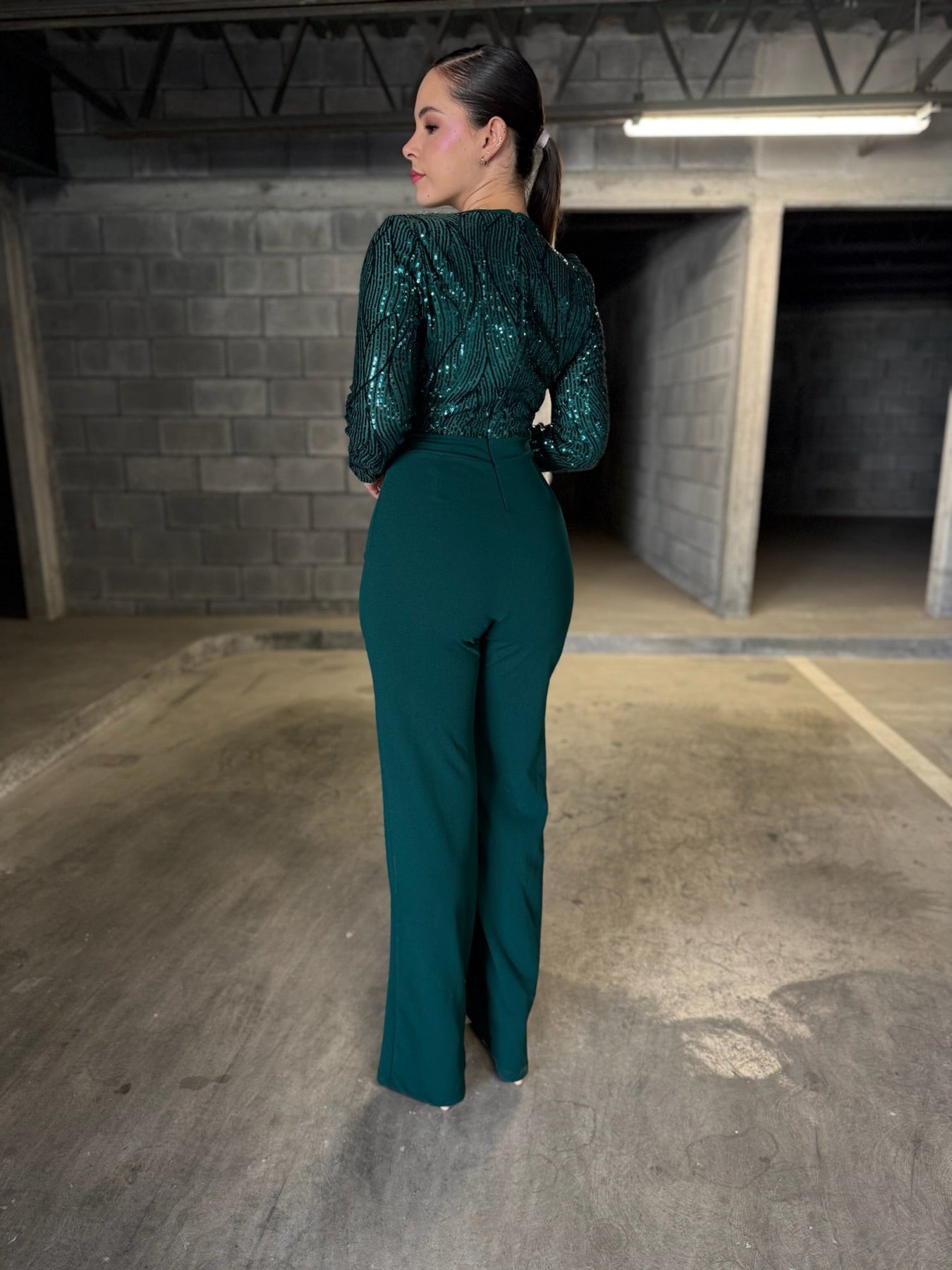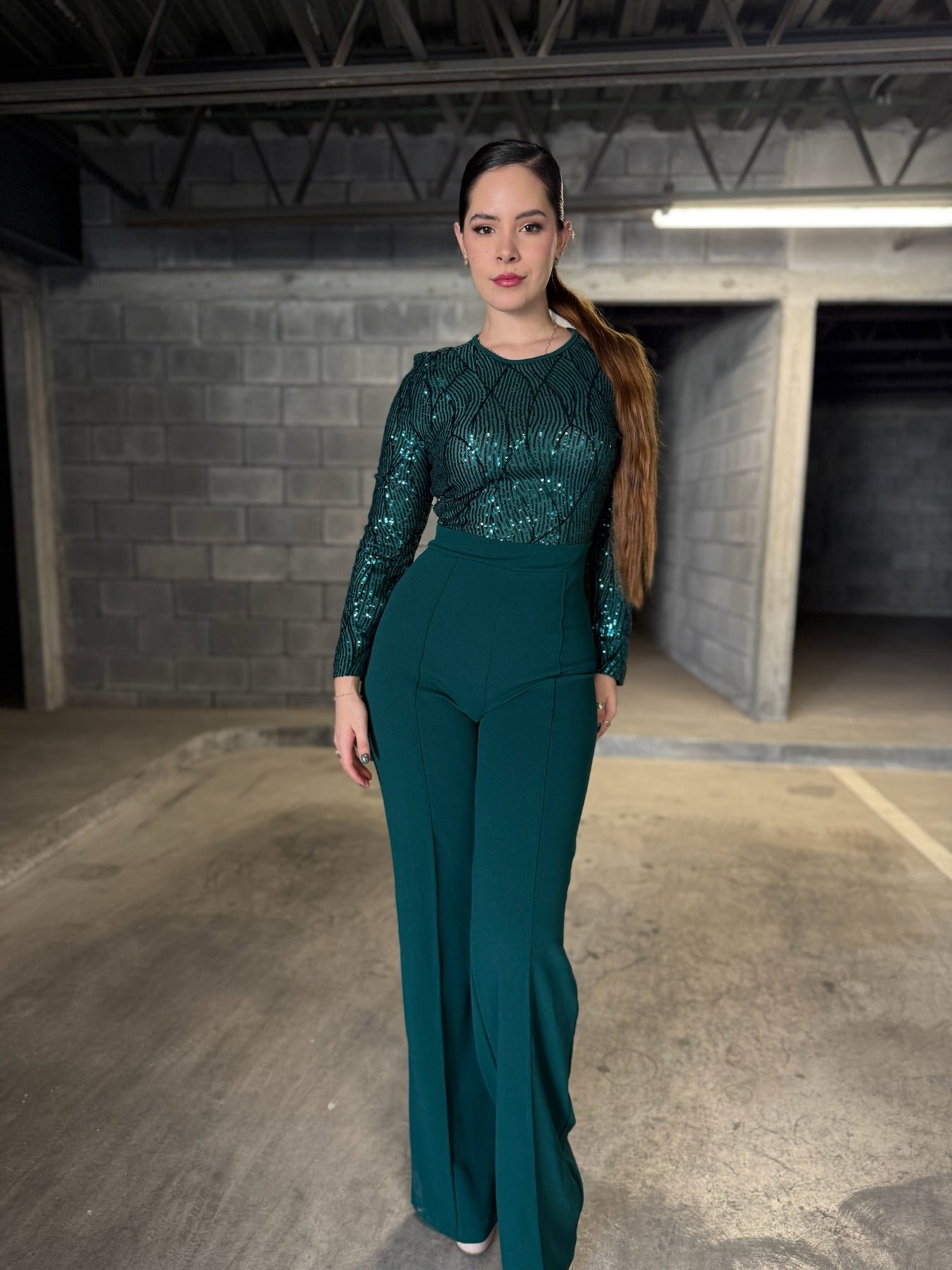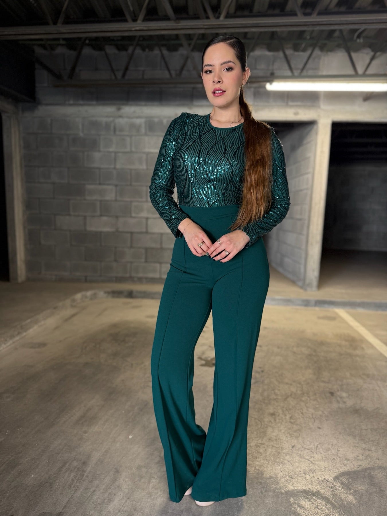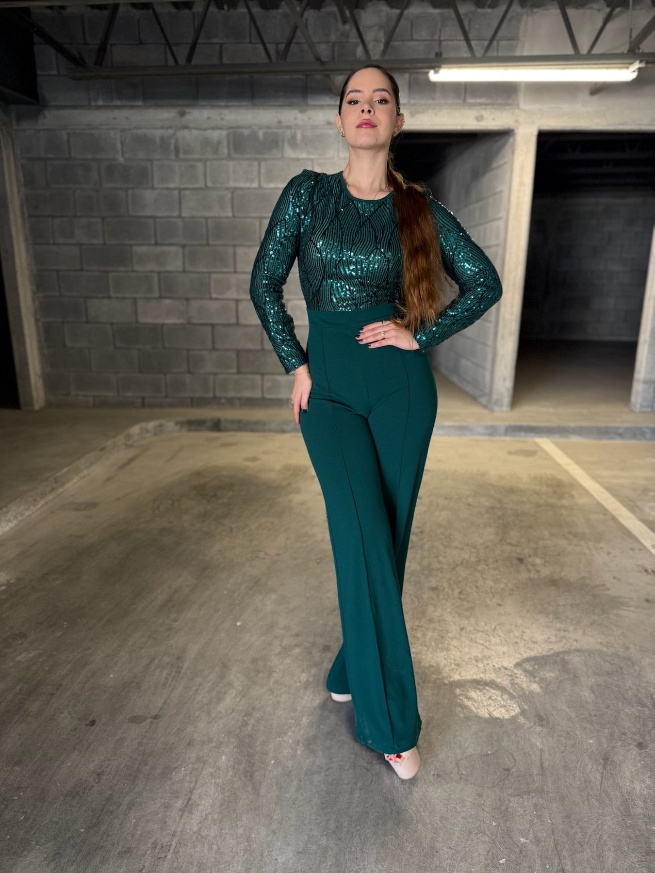 Top de manga larga diseño en lentejuelas + palazzo alta costura. Elegancia y piernas infinitas en un solo clic.