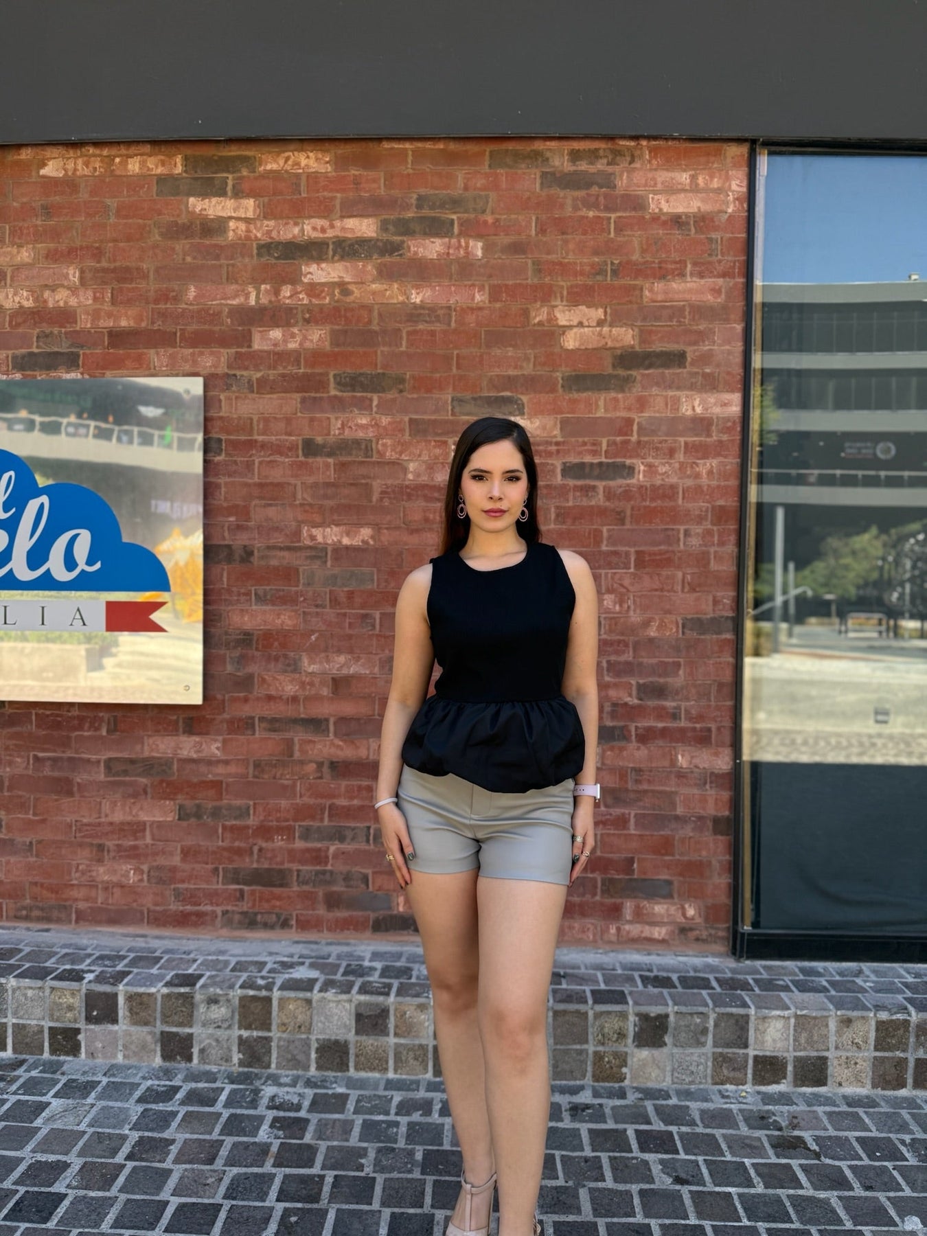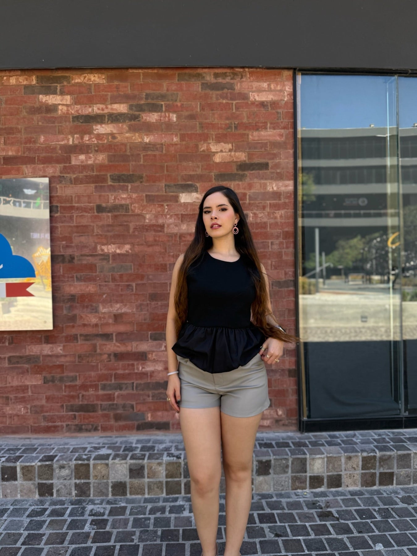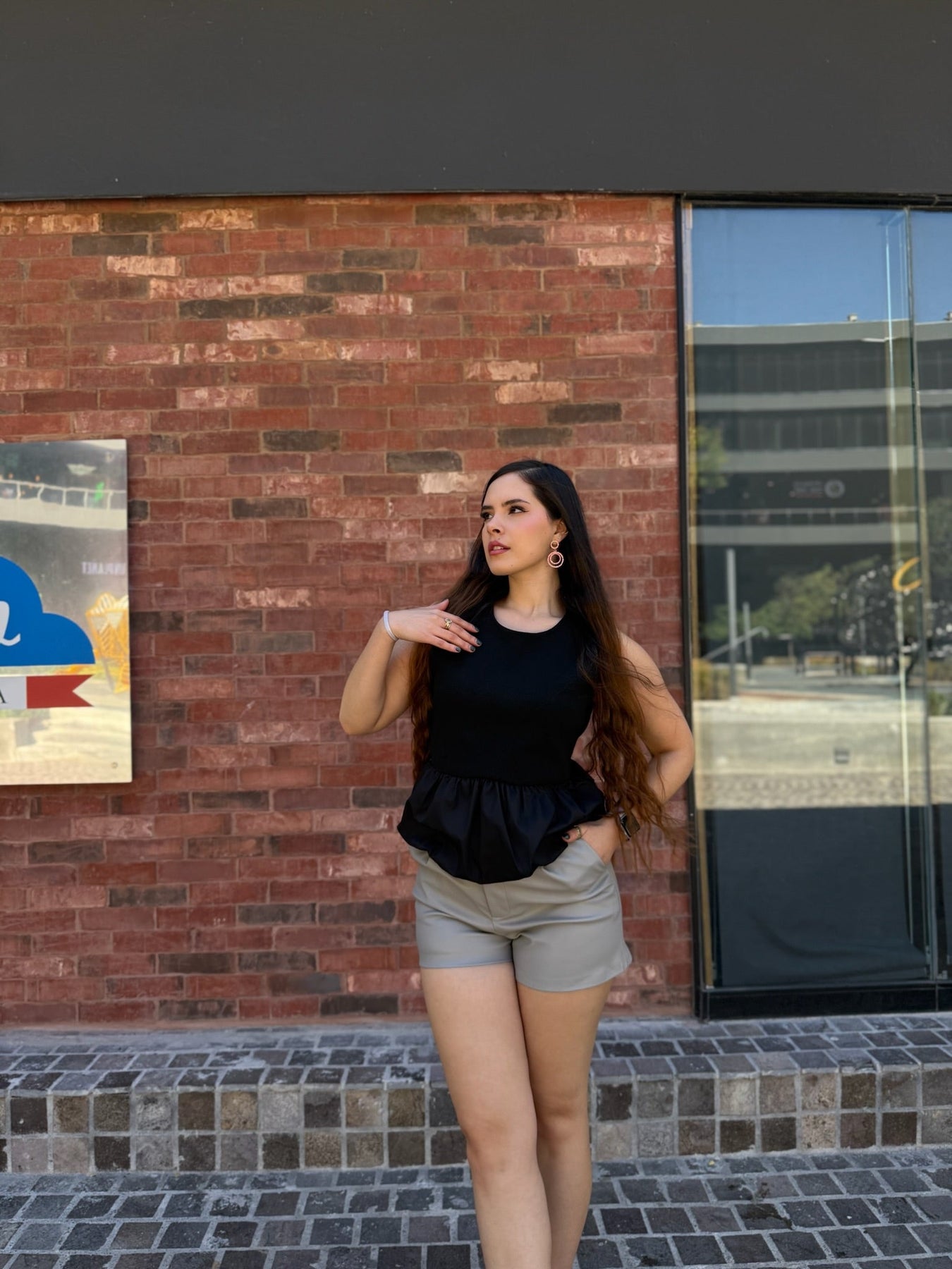 Short de tiro alto con textura suave tipo piel, estructura sutil y pinzas que estilizan la figura. Su tono neutro aporta elegancia y versatilidad.