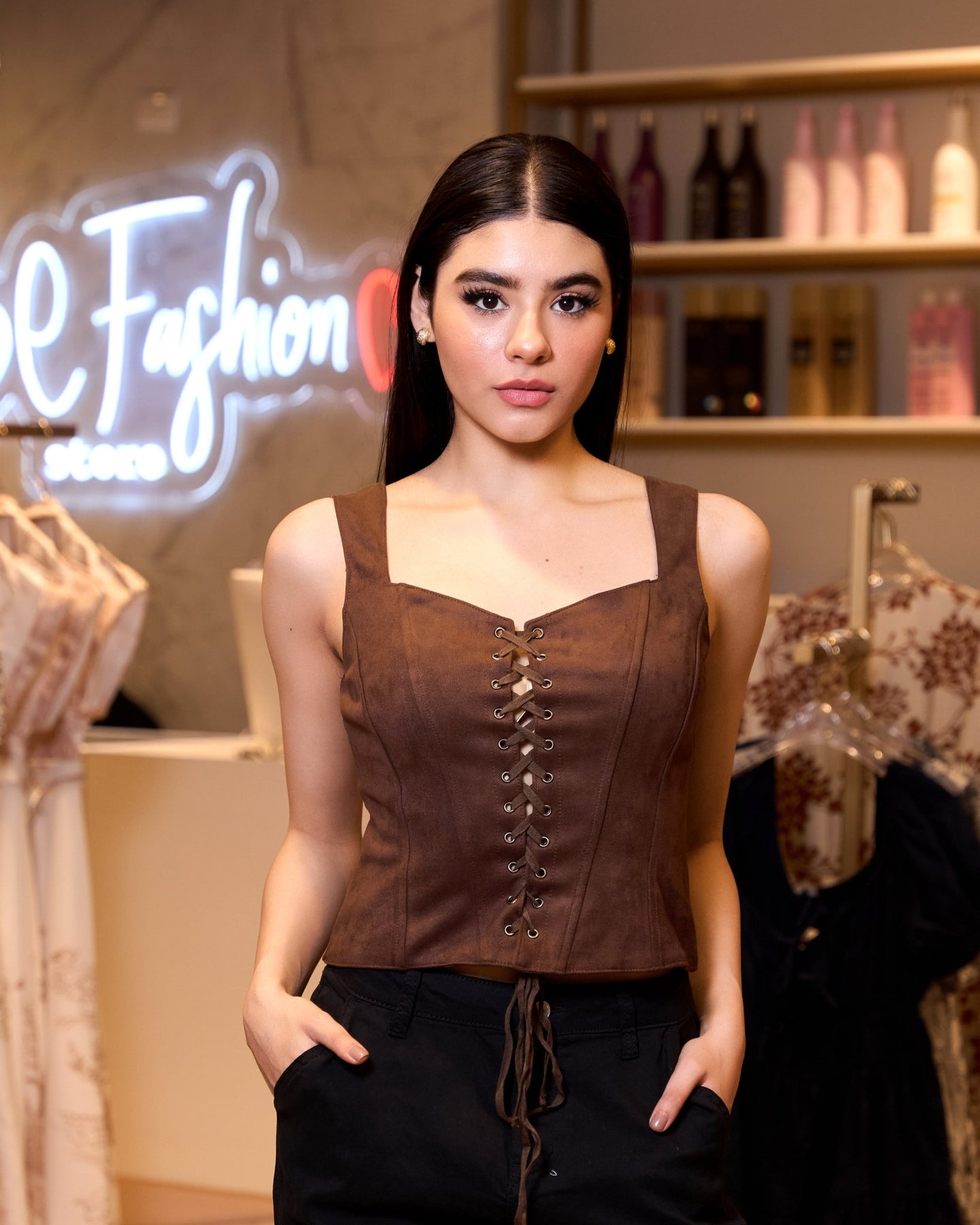 Un diseño moderno con toque vintage que eleva cualquier look. Este top estilo corset en color café está confeccionado en tela tipo gamuza, con tirantes anchos y cordones frontales ajustables que permiten definir la silueta. Perfecto para crear outfits casuales con jeans o faldas, o bien, looks más sofisticados al combinarlo con pantalones de vestir y tacones.