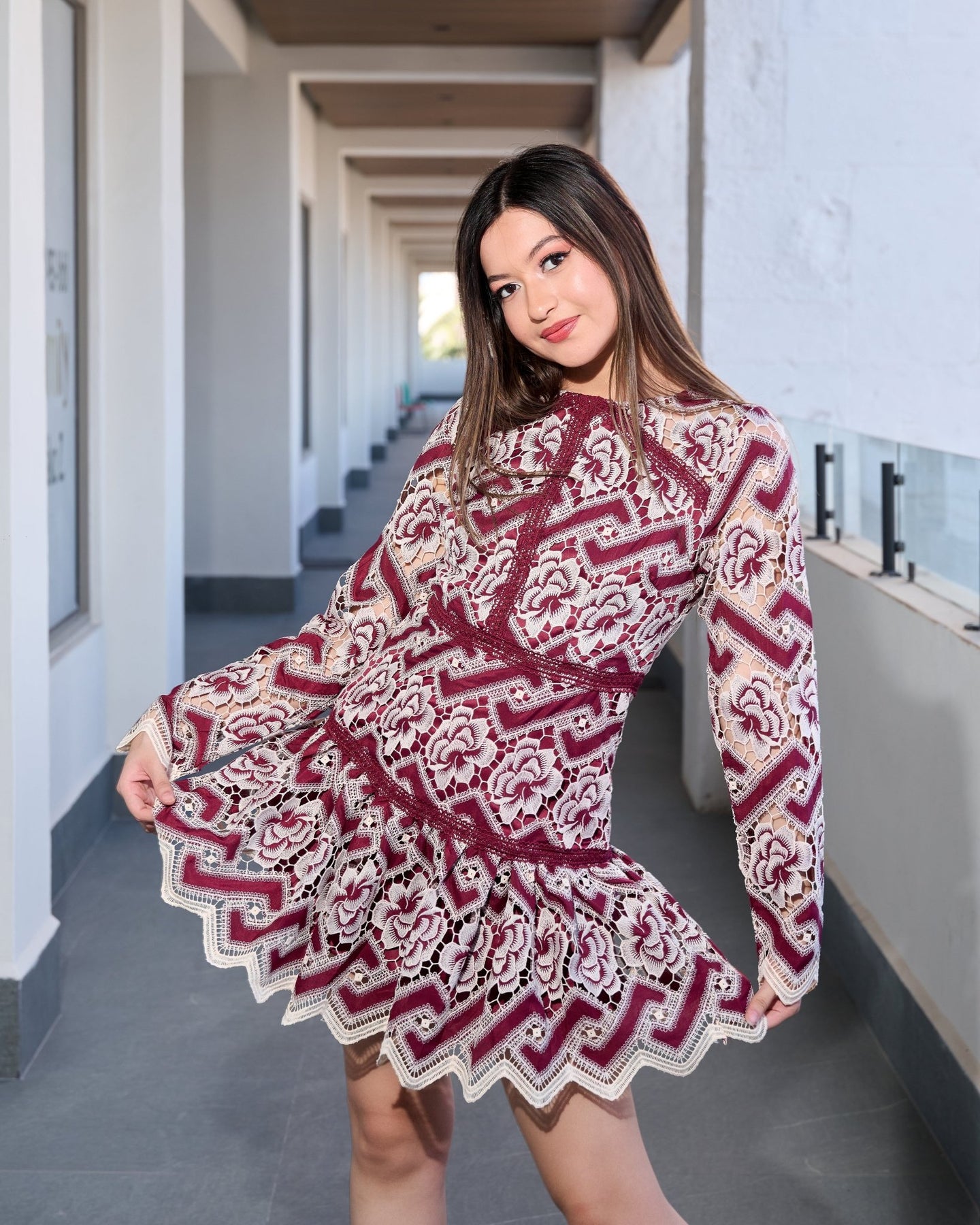 Un diseño sofisticado y femenino. Este vestido corto en tono burdeos destaca por su encaje floral en contraste con fondo nude y patrones geométricos que lo hacen único. Sus mangas largas y detalle de olan en el bajo lo convierten en una prenda elegante y chic, perfecta para eventos especiales y ocasiones formales.