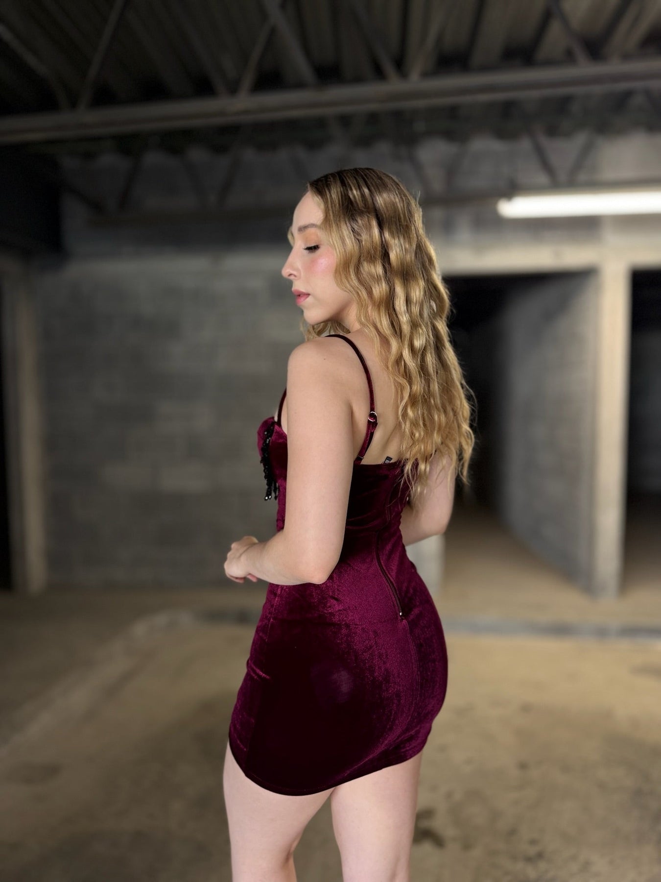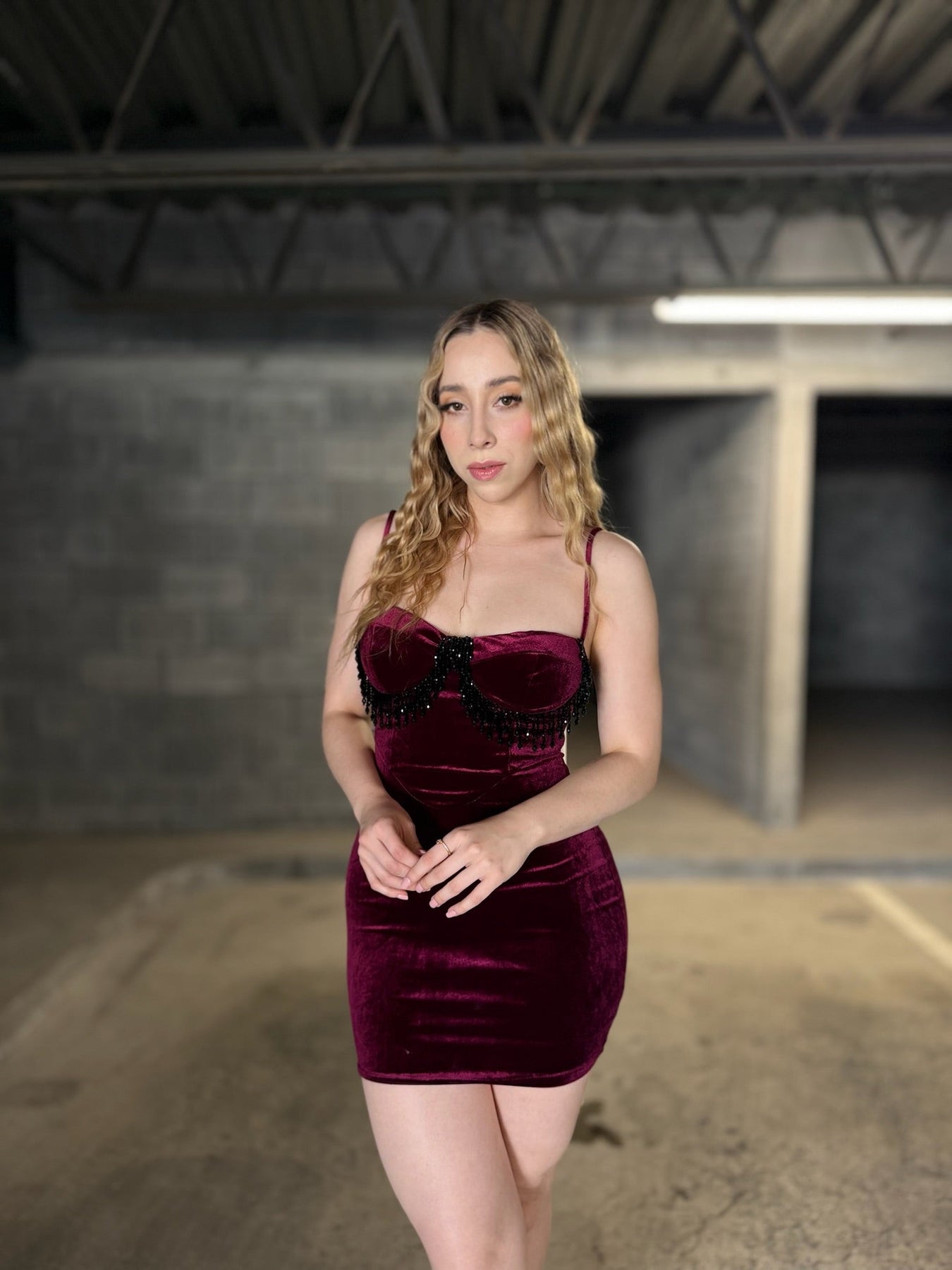 Vestido en terciopelo burdeos premium, escote corazón con tirantes finos y flecos de cristal negro que se mueven con cada paso. Sexy, elegante y listo para robar miradas.