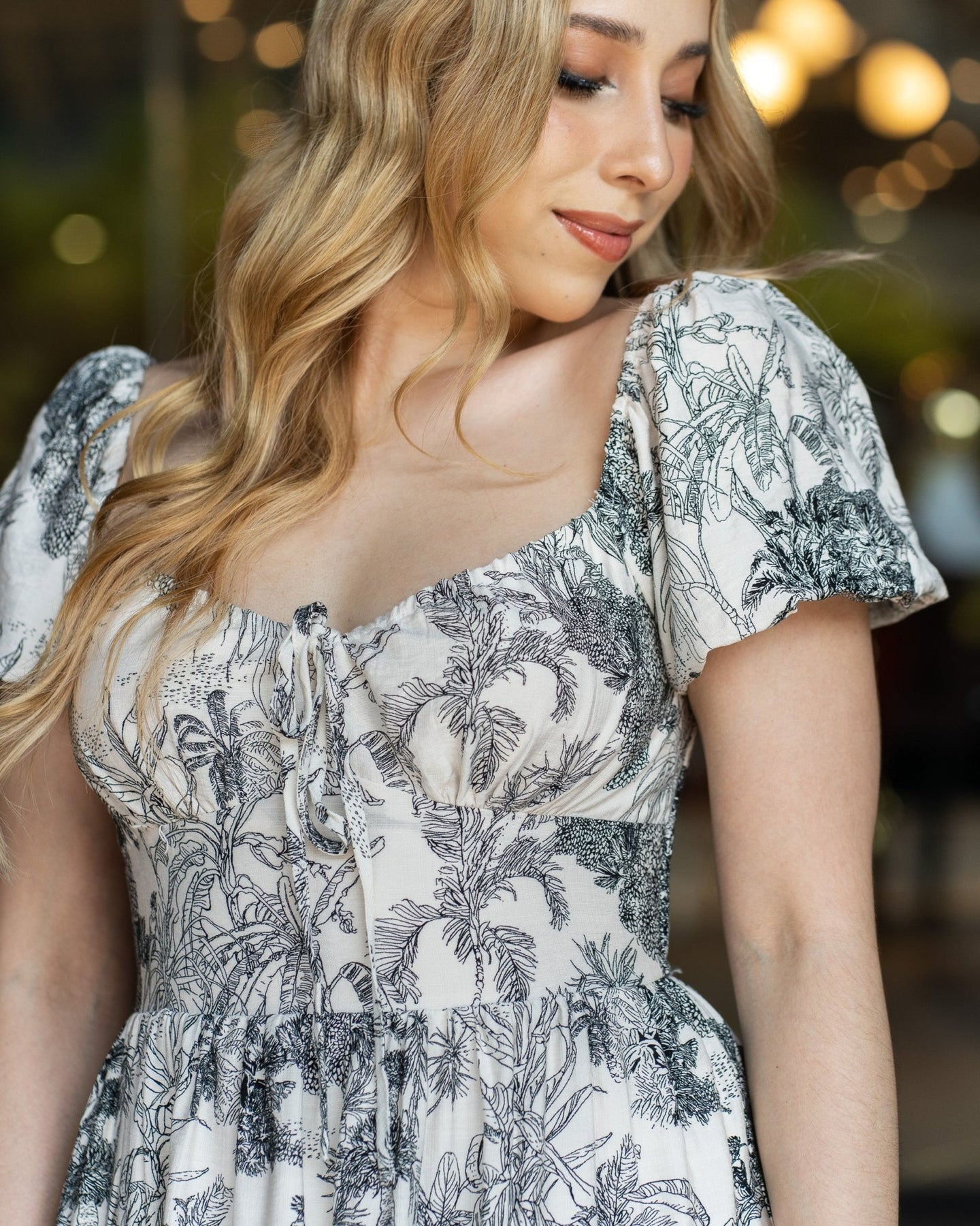 Vestido corto estampado botánico y manga corta abullonada, detalle fruncido en busto y una silueta fluida.