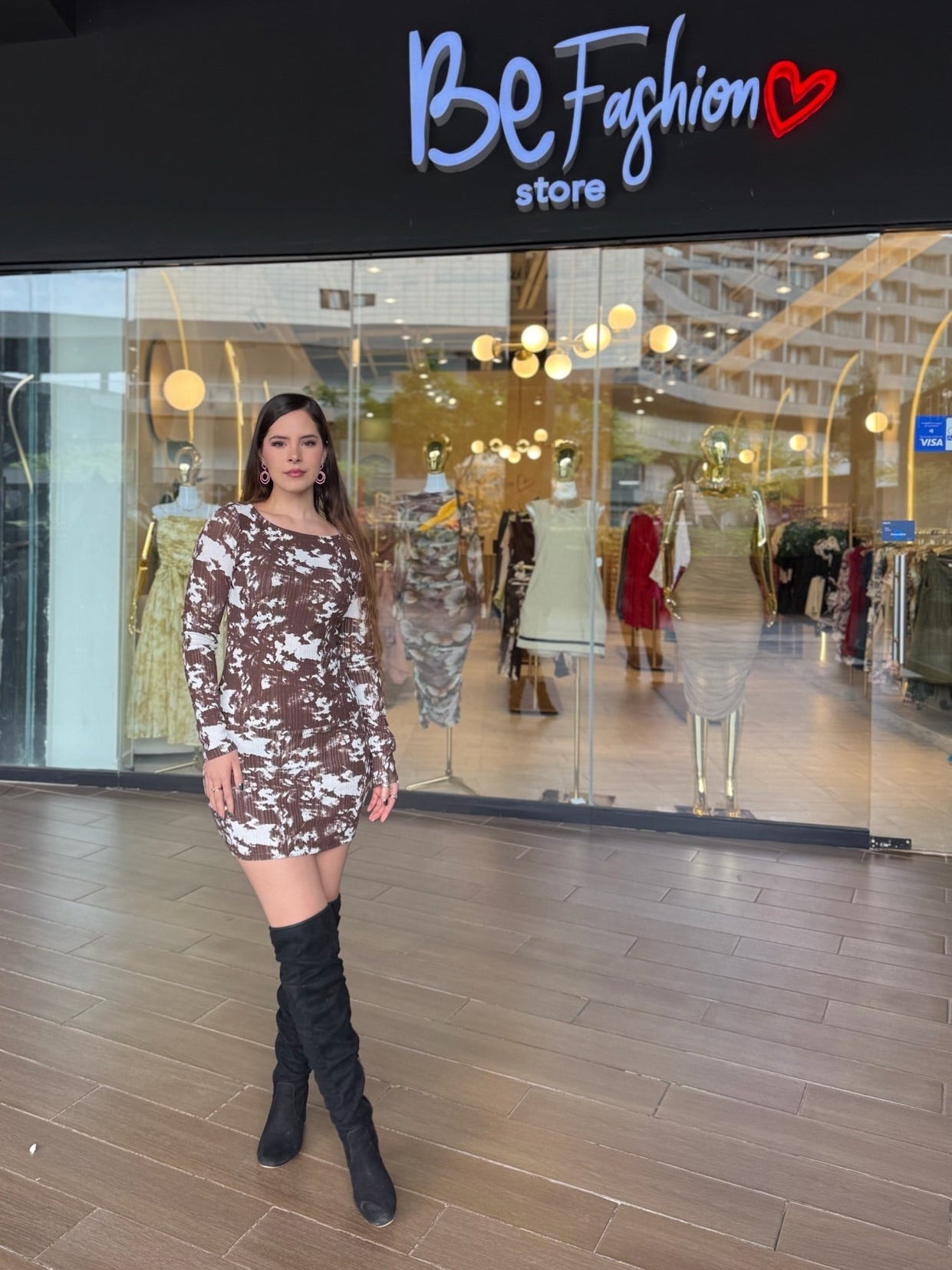 Vestido de canalé elástico con estampado tipo cow print en tonos neutros. De corte ajustado y manga larga, realza la silueta con un aire moderno y relajado.