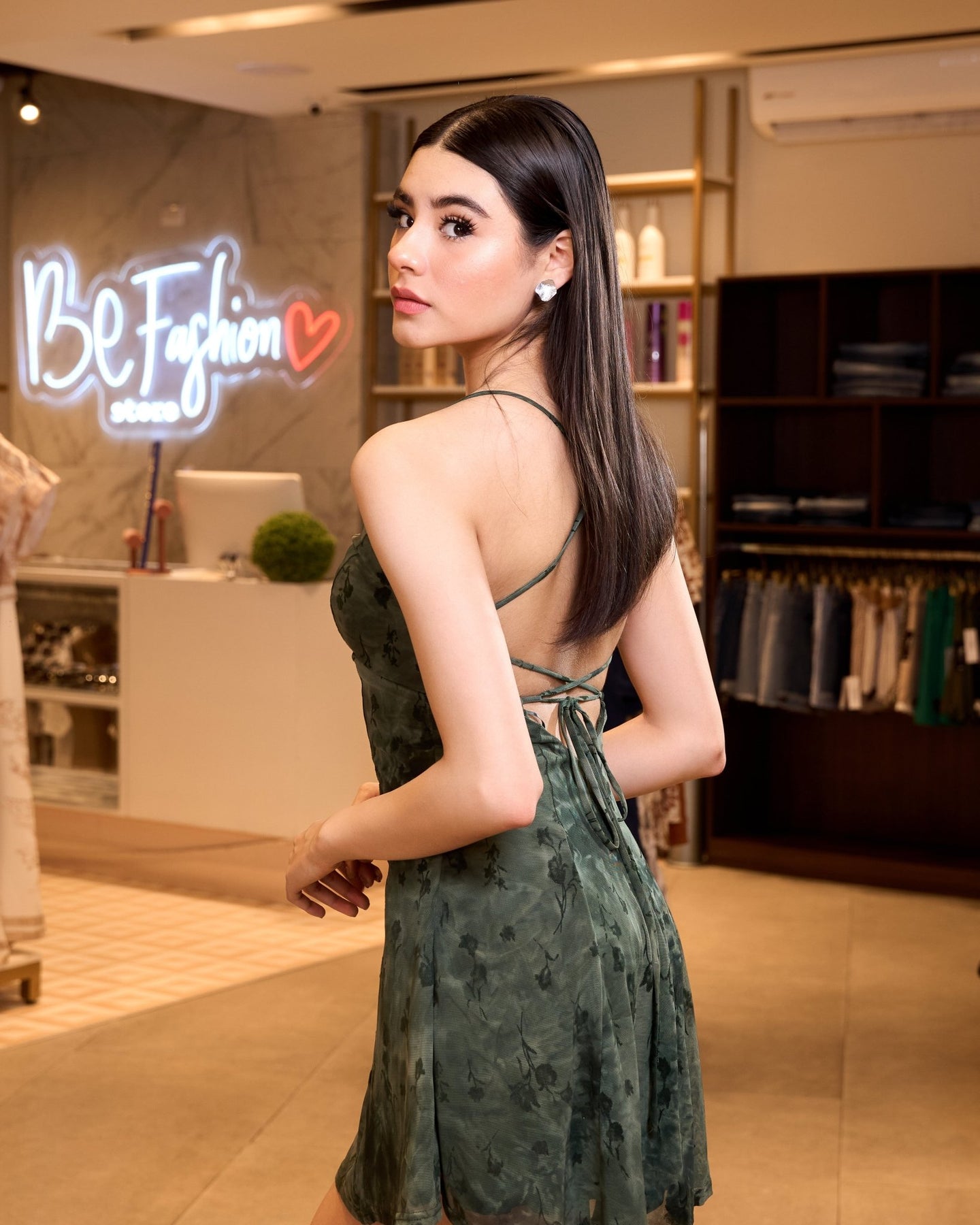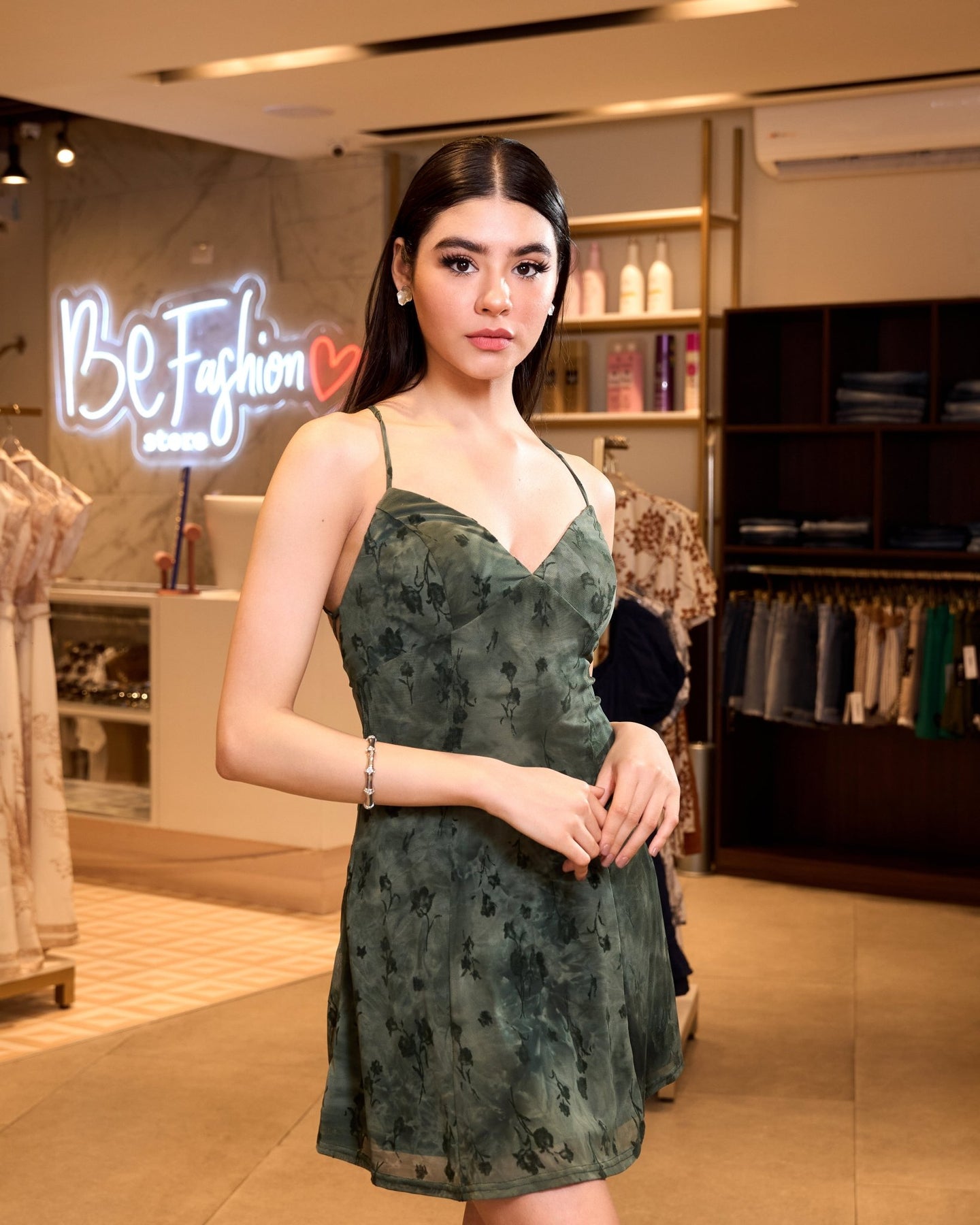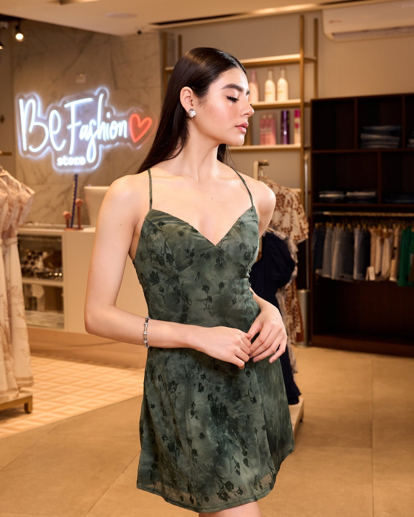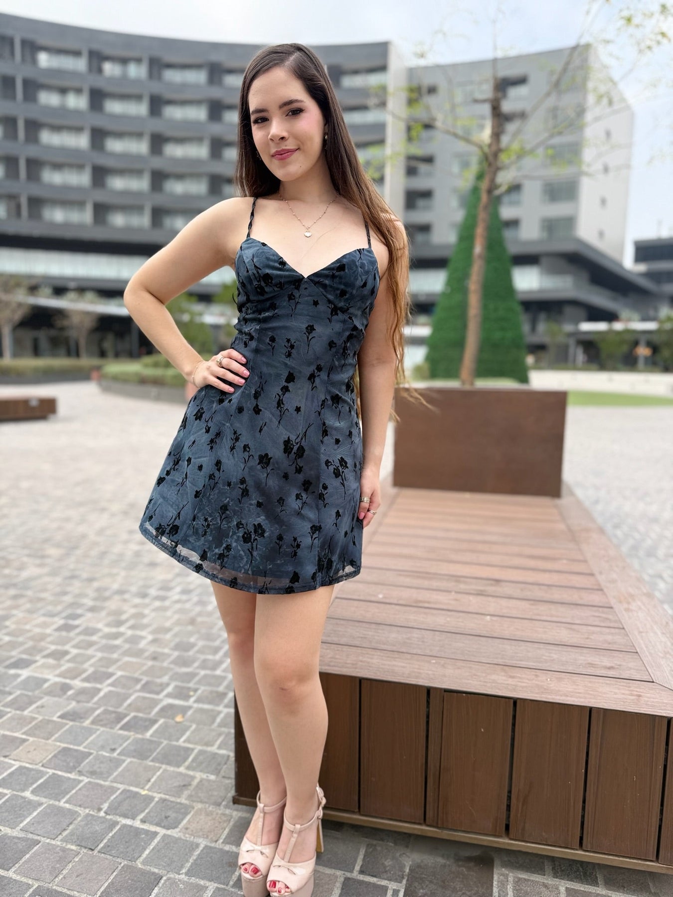Escote corazón, tirantes finos, efecto terciopelo quemado con flores negras y largo mini que grita peligro.