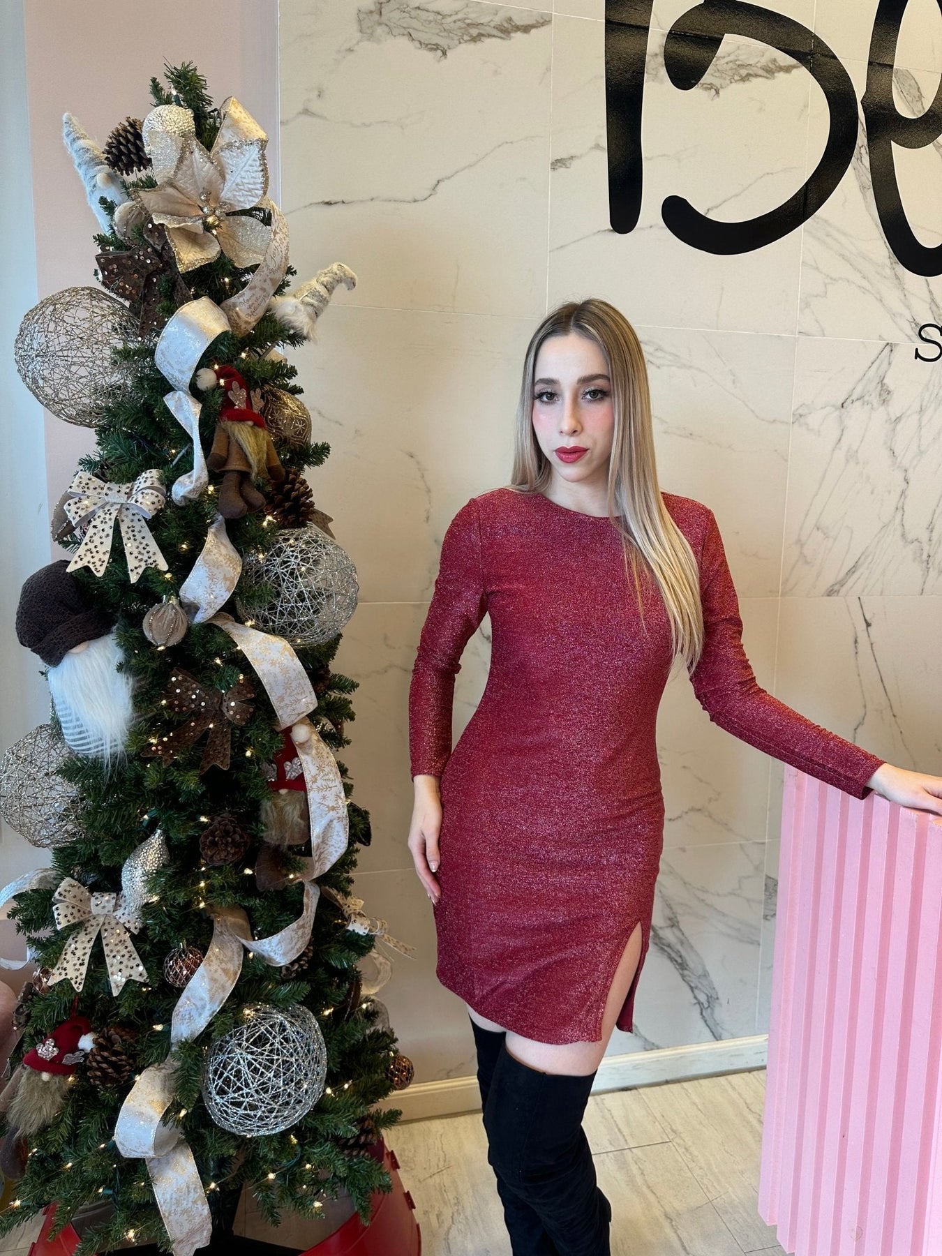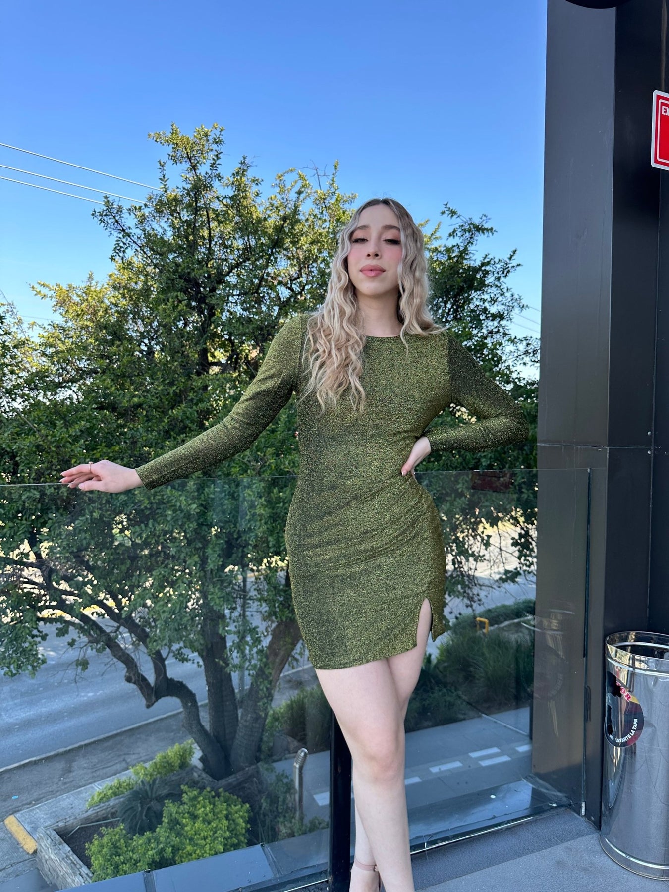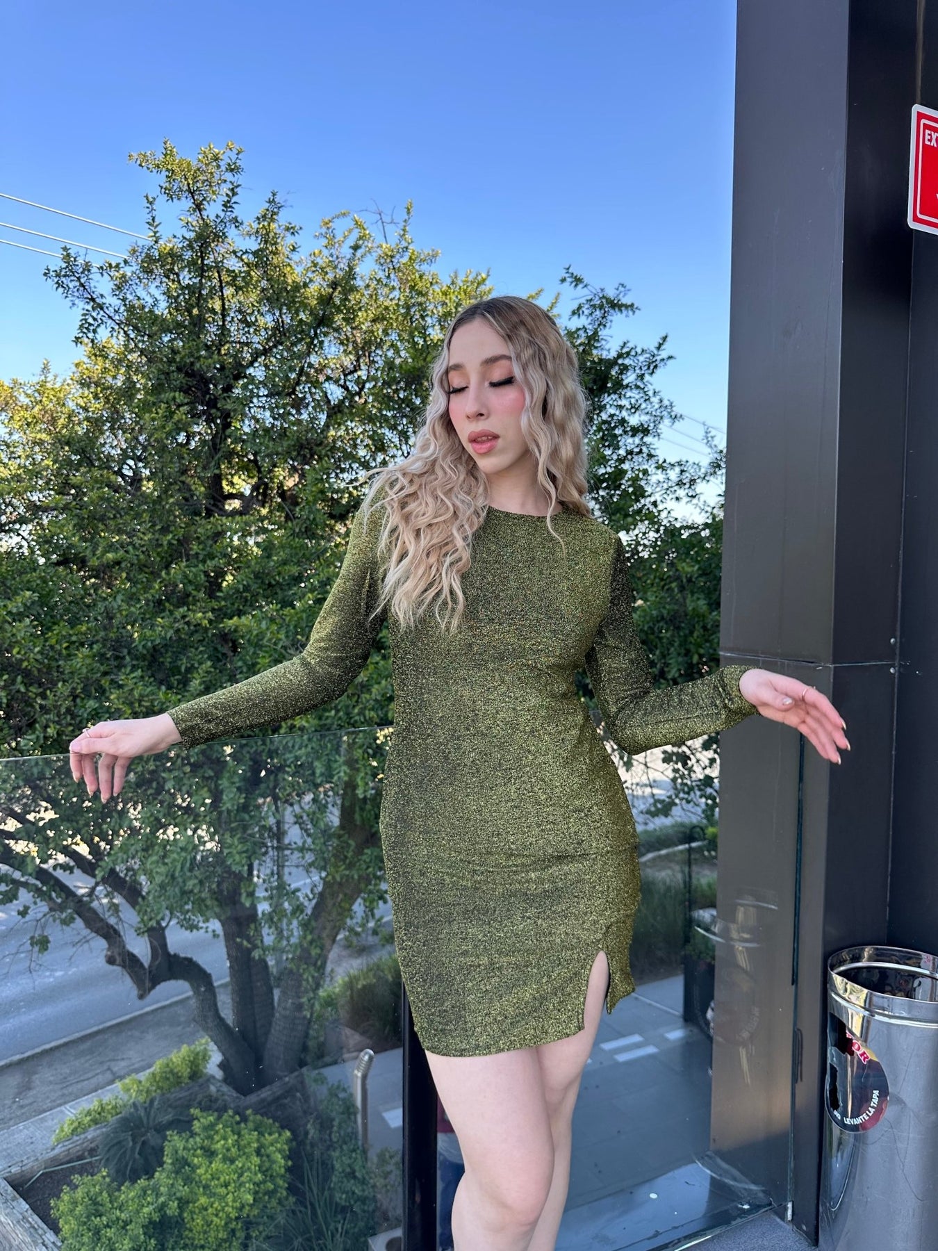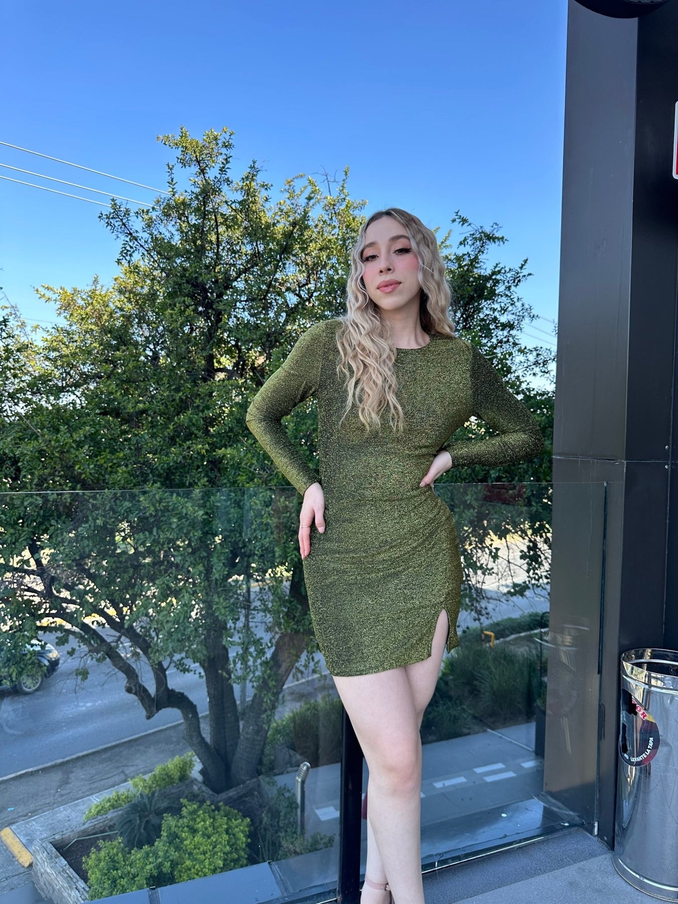 Vestido metalizado cuello redondo con abertura.