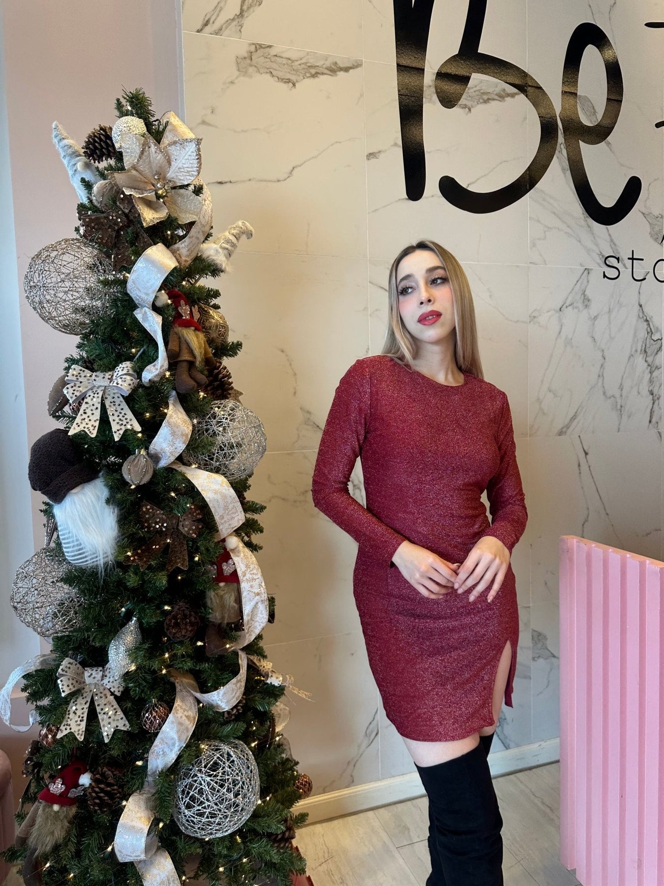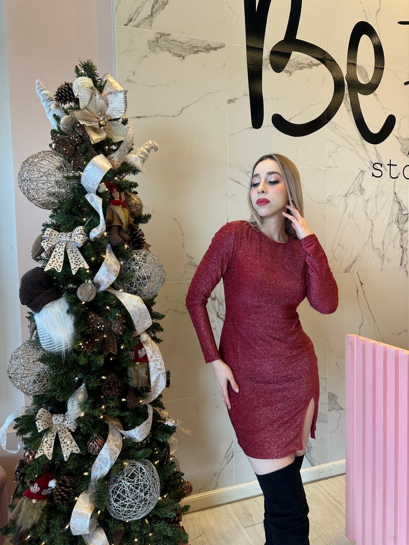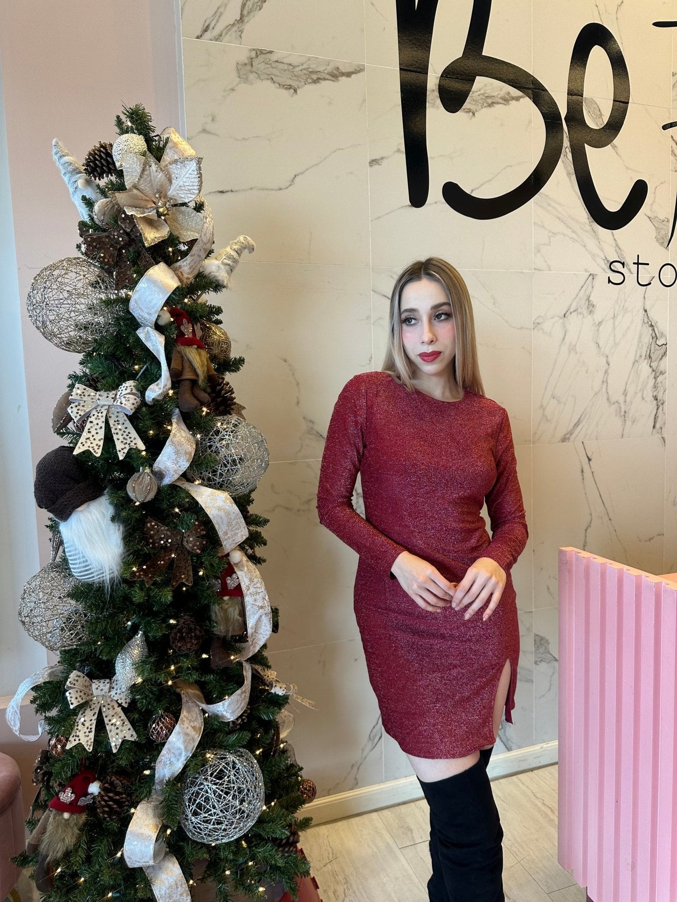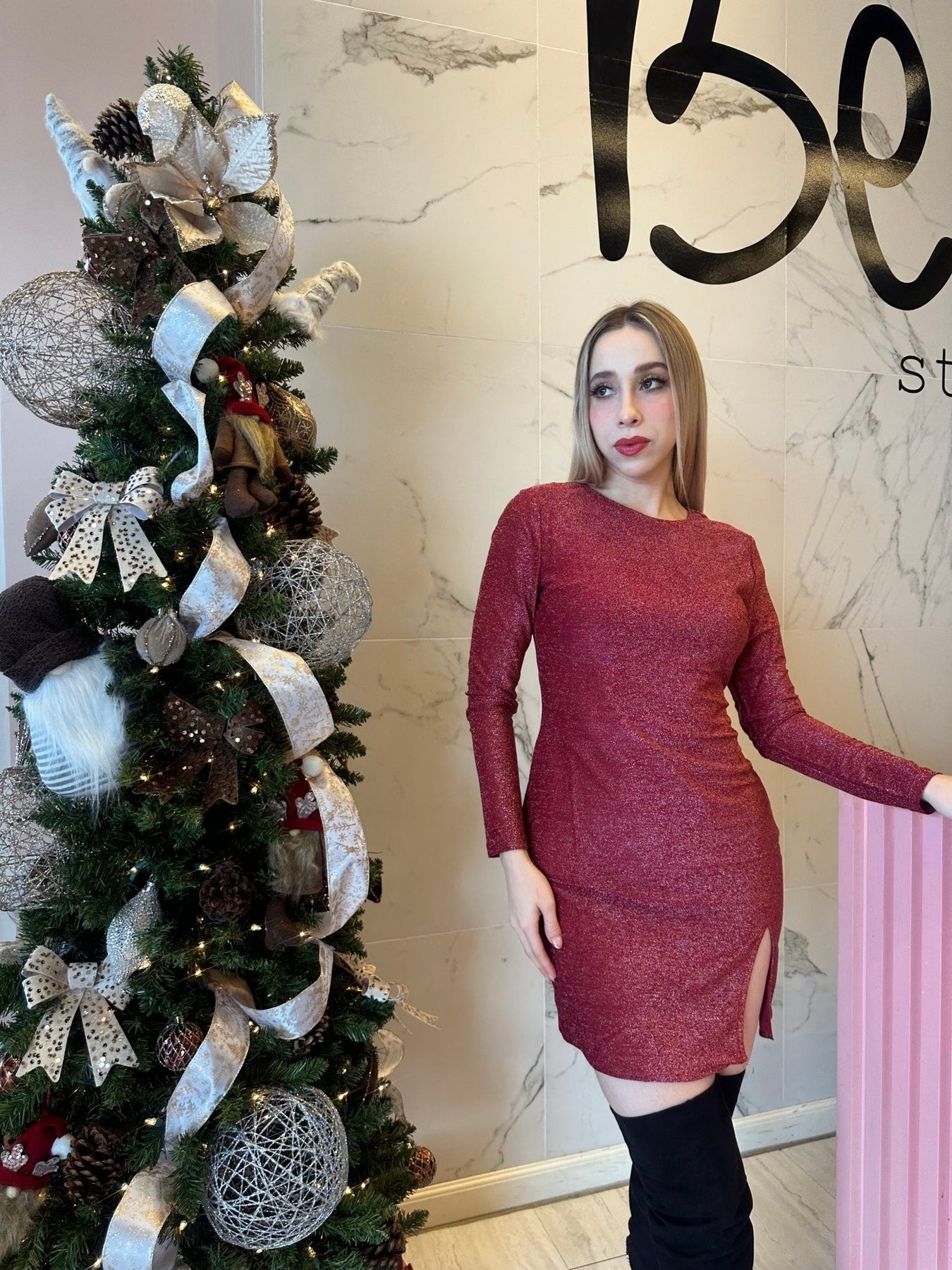 Vestido metalizado cuello redondo con abertura.