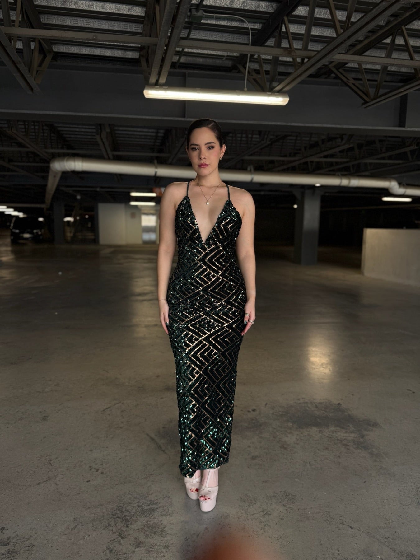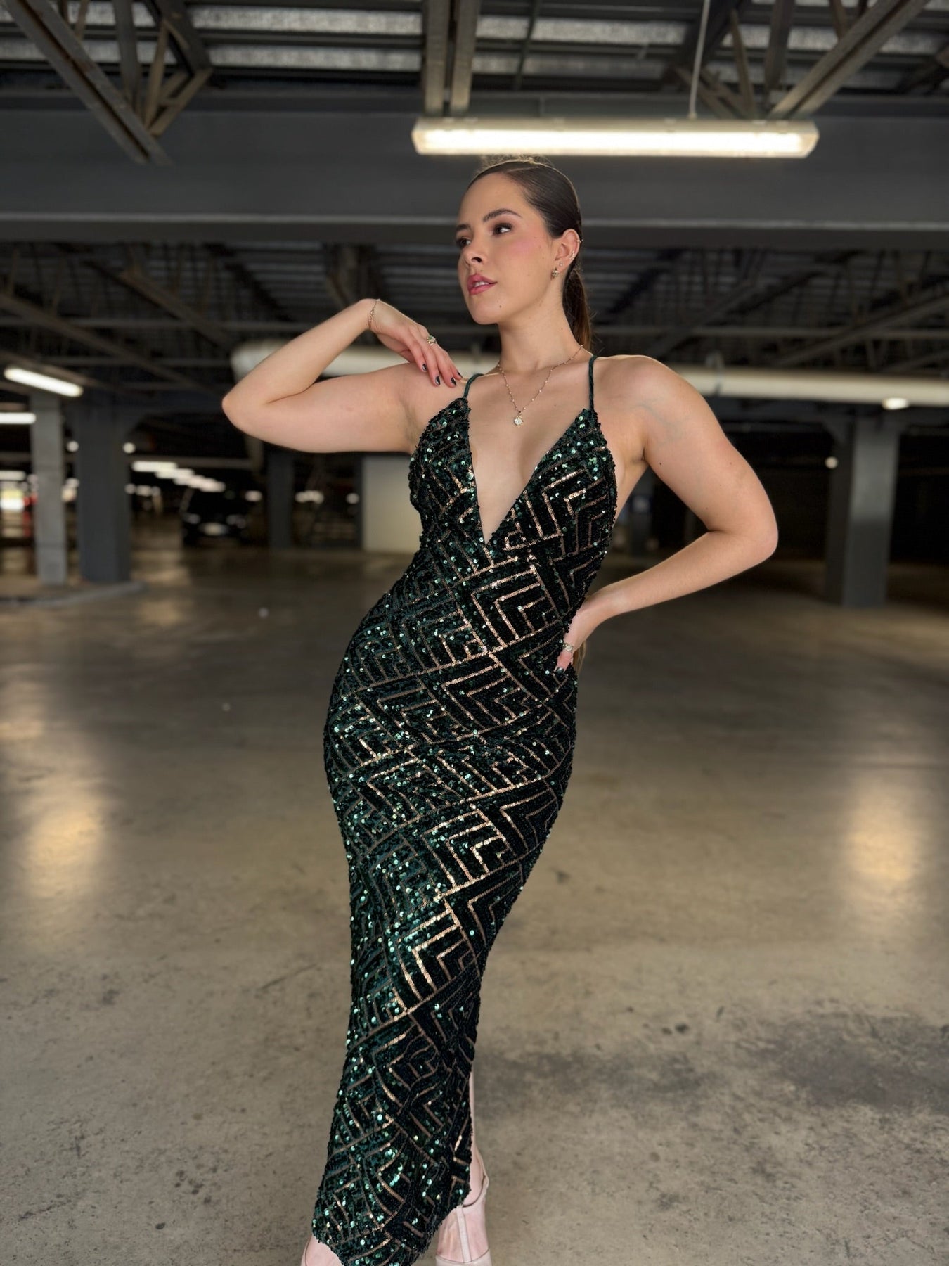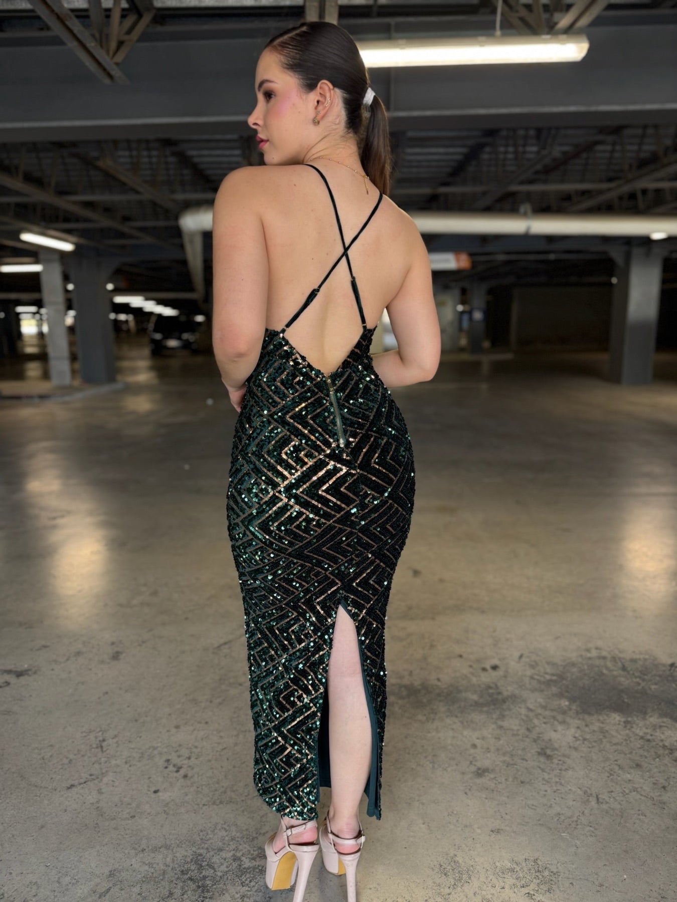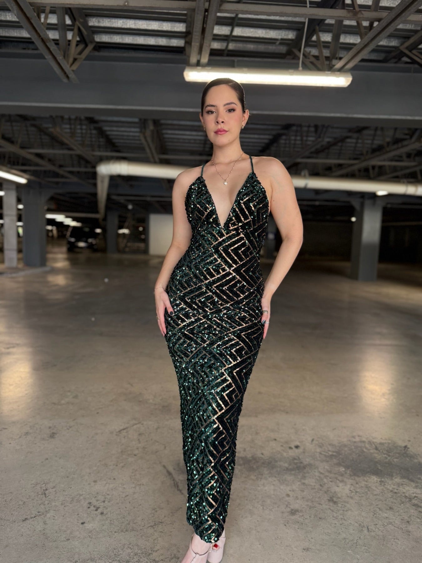Lentejuelas verde botella y oro formando rombos perfectos sobre tul premium. Escote V profundo, espalda cruzada ultra sexy, abertura trasera y corte sirena que estiliza al extremo. Brillo líquido en cada paso.