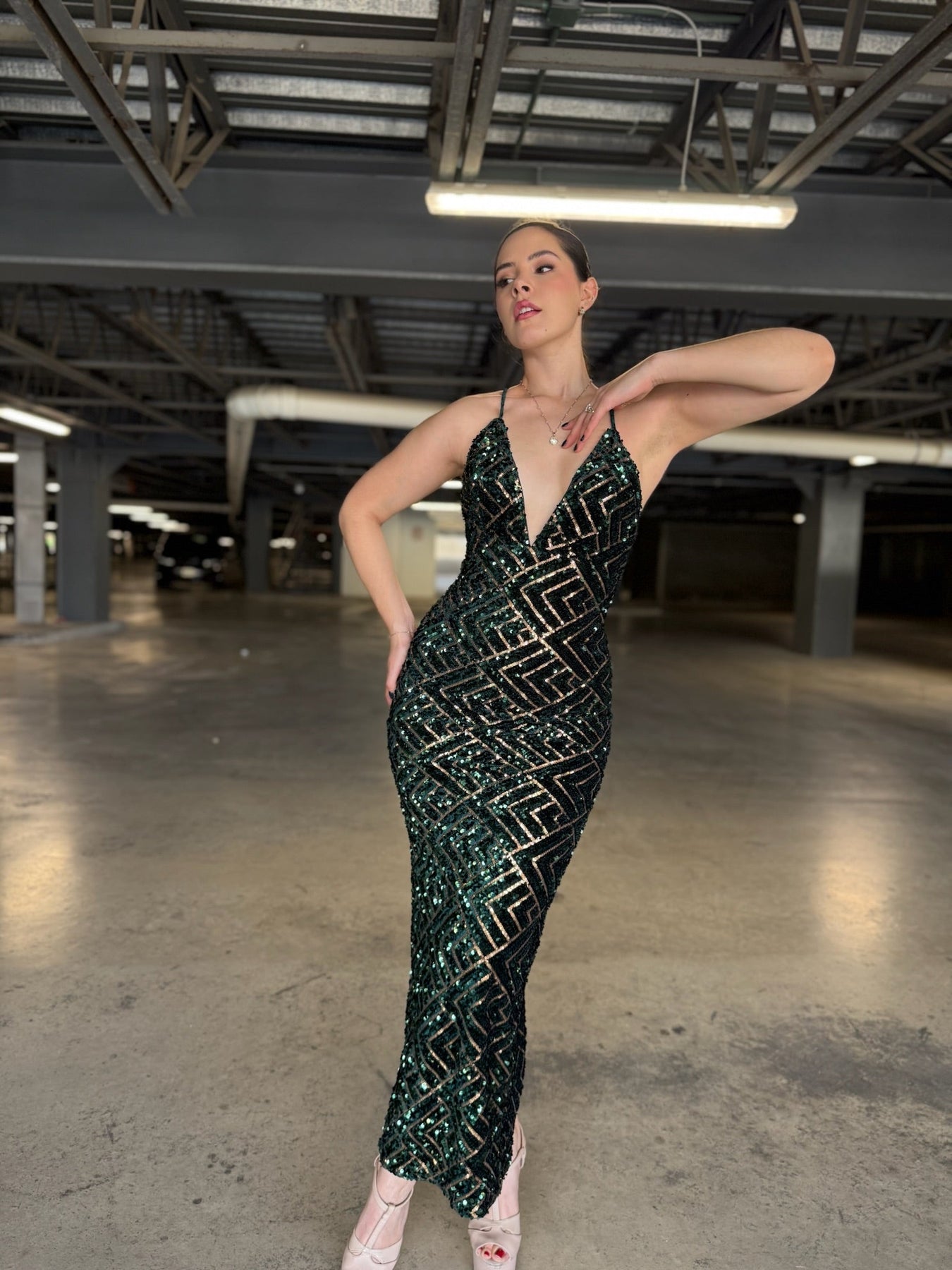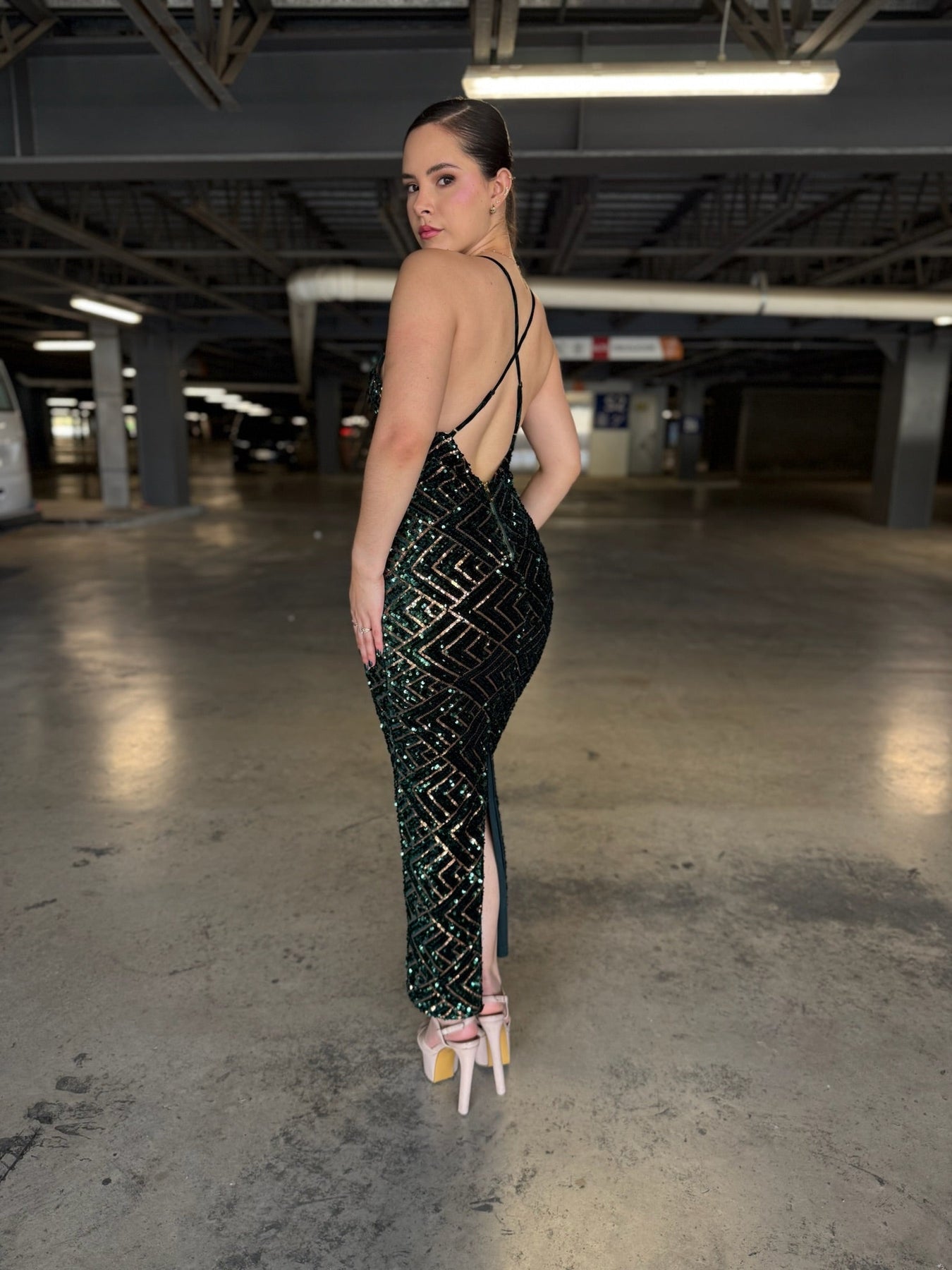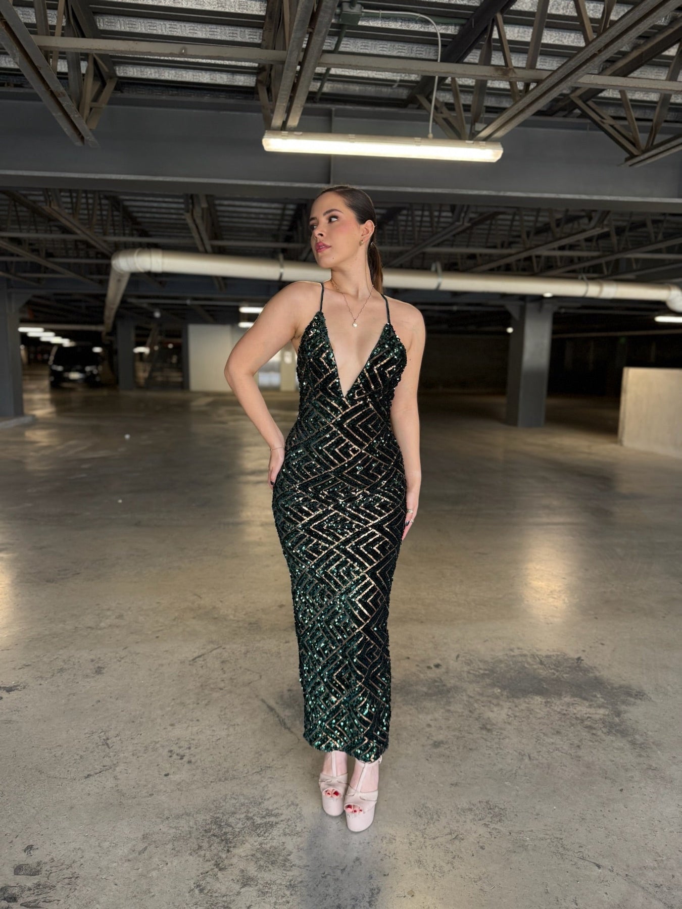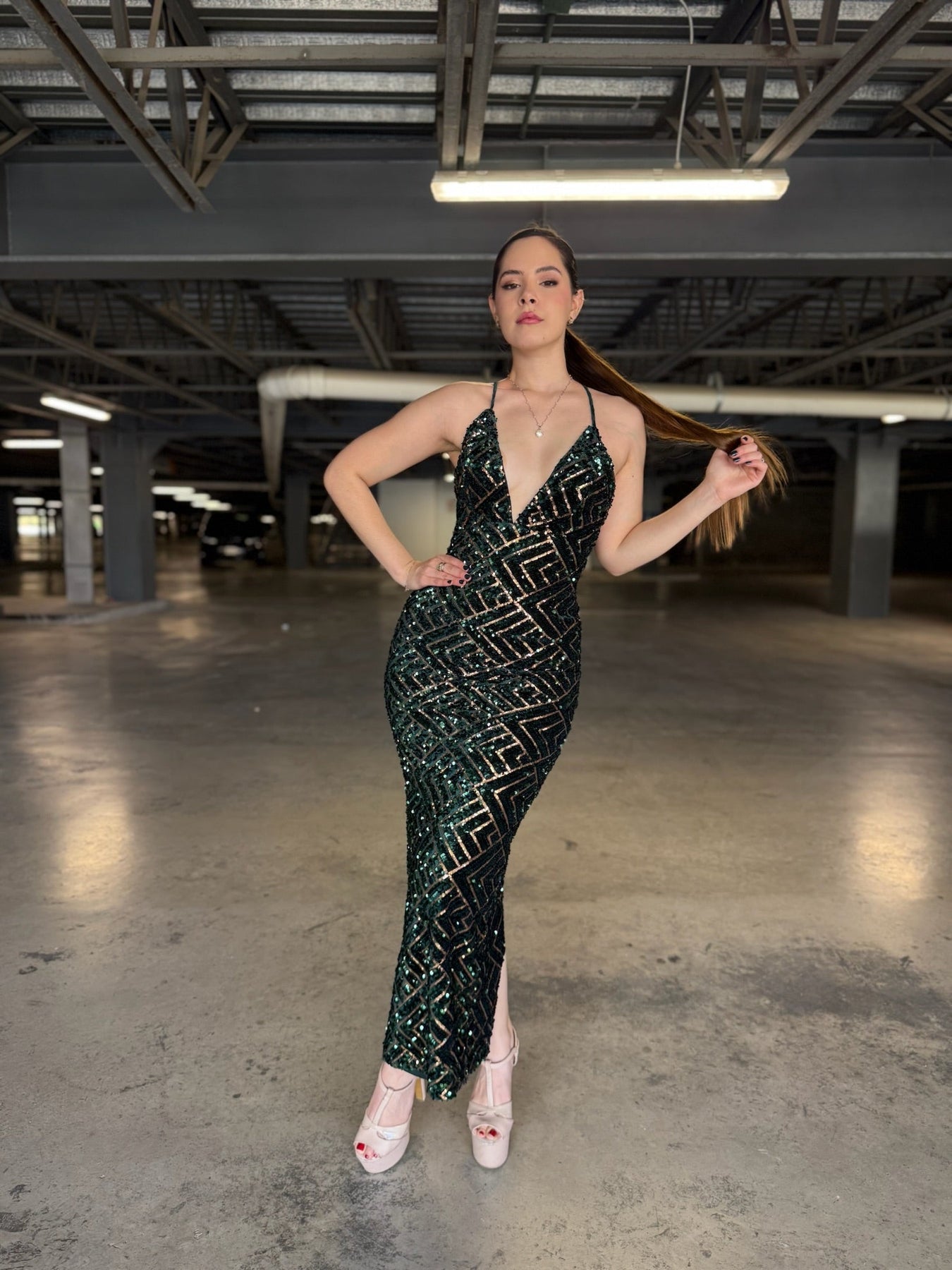 Lentejuelas verde botella y oro formando rombos perfectos sobre tul premium. Escote V profundo, espalda cruzada ultra sexy, abertura trasera y corte sirena que estiliza al extremo. Brillo líquido en cada paso.